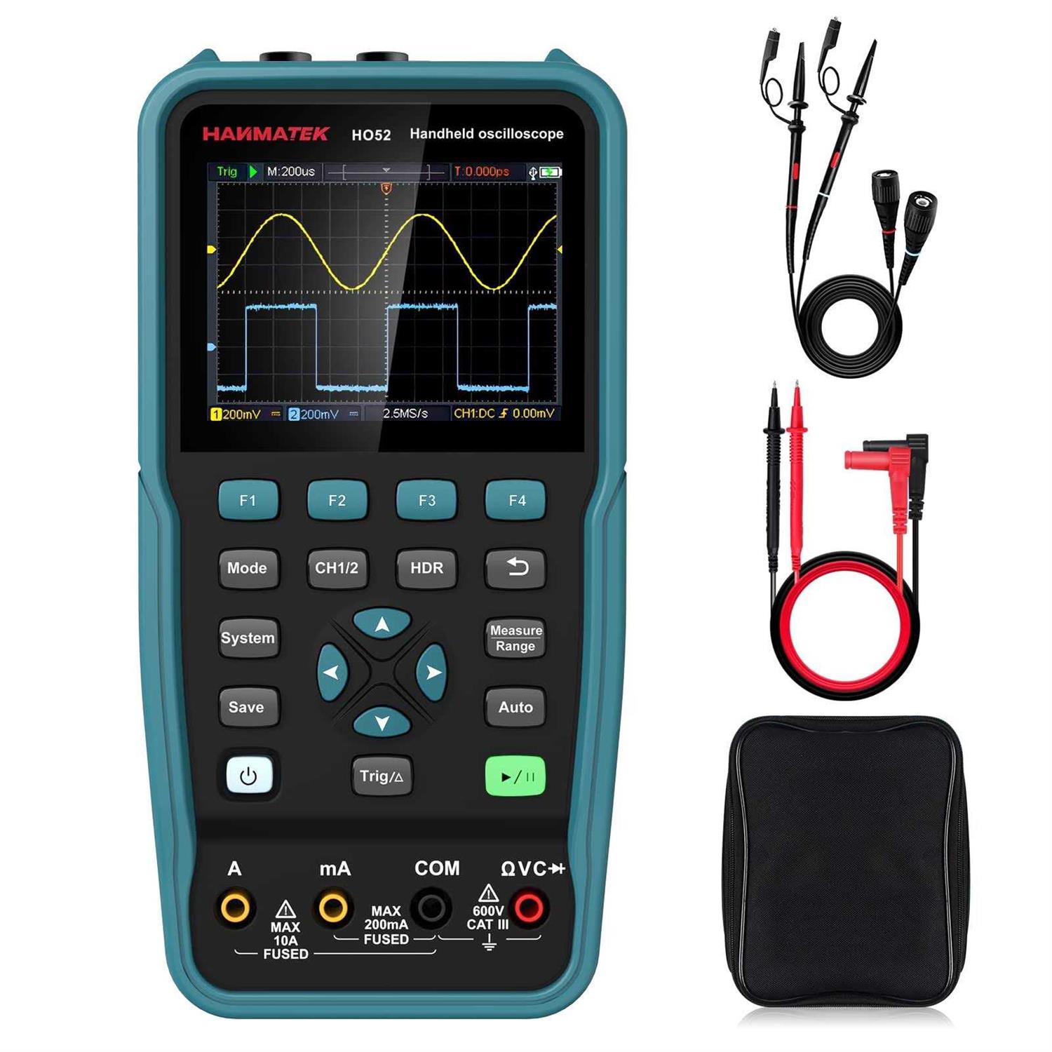 HANMATEK Handheld Digital Oscilloscope 50Mhz Bandwidth with 2 Channels HO52 3.5TFT Mini Oscilloscope, 2 in 1 Oscilloscope and Multimeter