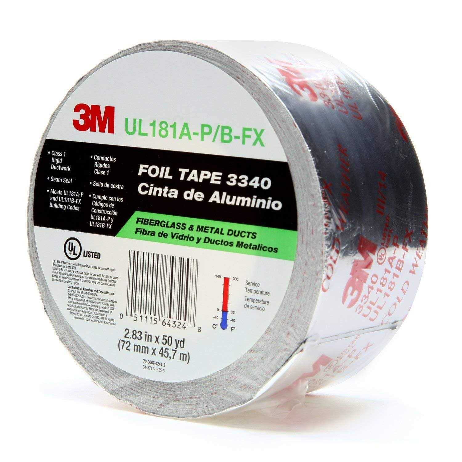 3M Scotch 3340 Foil Tape: 2-1/2 in. x 50 yds. Silver – 3M 3340 Foil Tape is a high temperature, high strength aluminum foil tape coated with a cold weather acrylic pressure sensitive adhesive. This tape is constructed using a 2.0 mil aluminum foil backing with a strong, pressure sensitive acrylic adhesive for long-term adhesion, along with an easy releasing poly coated kraft paper liner to protect the adhesive and keep the tape ready for use. The aggressive acrylic adhesive performs in both cold and hot temperature conditions. An essential requirement for sealing ducts and other surfaces for heating, ventilation and air conditioning systems is foil tape that can stand up to hot and cold temperatures. The foil backing of 3M 3340 serves as an excellent barrier against moisture, dust, and many chemicals. The very low moisture vapor transmission rate makes the tape a good sealant and the acrylic adhesive supplies superior temperature and UV resistance to give you a strong, lasting, and reliable bond. 3M Foil Tape is used in industries such as transportation, metalworking, construction, automotive, military and government, general industrial, electronics, aerospace, and more. Product Applications High performance duct closures High strength aluminum foil backing is ideal for rigid duct board and flexible duct Vapor seal on reinforced fiberglass duct board Excellent for hot and humid conditions Excellent performance and durability in any weather conditions Cold weather adhesive No special tools or process required for application Product Features 2.0 mil aluminum foil backing Listed for both UL181A-P and UL181B-FX Replaces mechanical fasteners for rigid duct board Thermally conductive backing helps heating and cooling efficiency Permanent acrylic adhesive Made in the U.S.