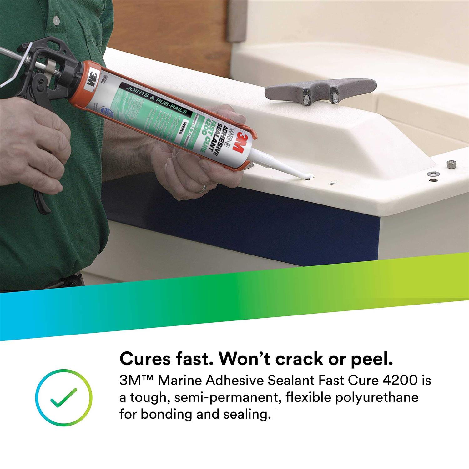 Ideal for rub-rails, stern-joints, deck and through-hull fittings, and access plates. Medium strength allows for disassembly.3M Marine Adhesive Sealant Fast Cure 4200FC bonds and seals fiberglass, gelcoat and wood Ideal for rub-rails, stern-joints, deck and through-hull fittings, and access plates Medium strength allows for disassembly Bonds and seals fiberglass, gelcoat and wood It is white in color Ideal for rub-rails, stern-joints, deck and through-hull fittings and access plates Comes in the color white The ATG tape system delivers a controlled application of the adhesive while the liner rewinds into the ATG applicator. It bonds on contact, and works on a variety of substrate or material combinations.