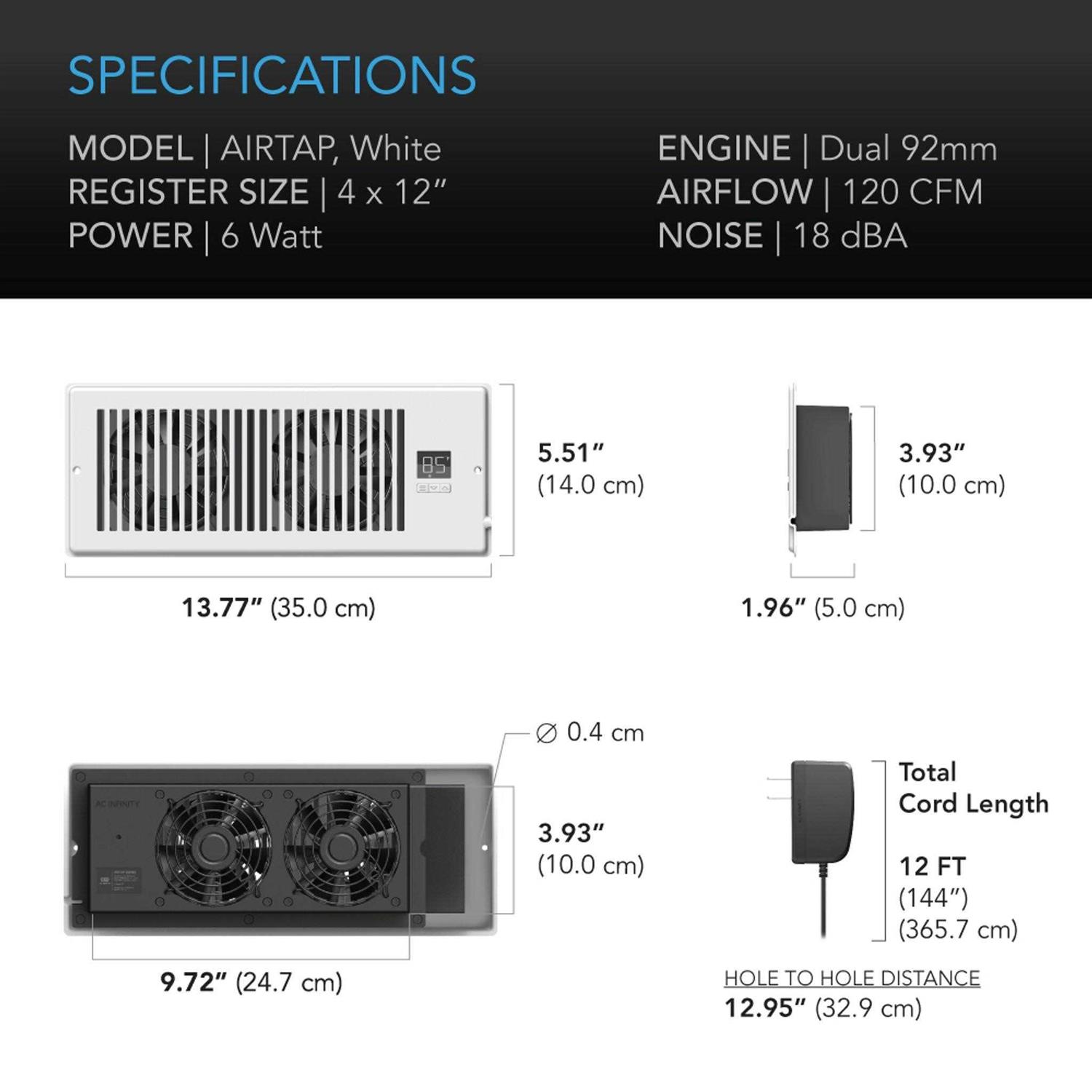 - Includes Wall Adapter | Fits 4 x 12 in Wall and Floor Registers | Airflow: 100 CFM | Noise: 18 Dba.