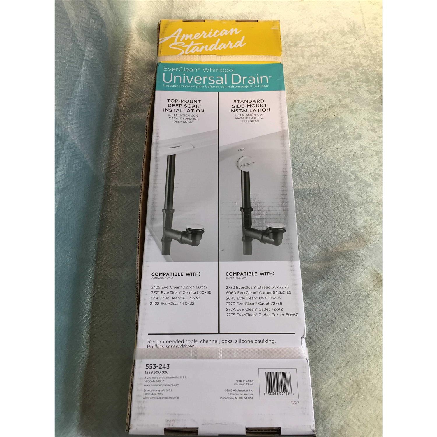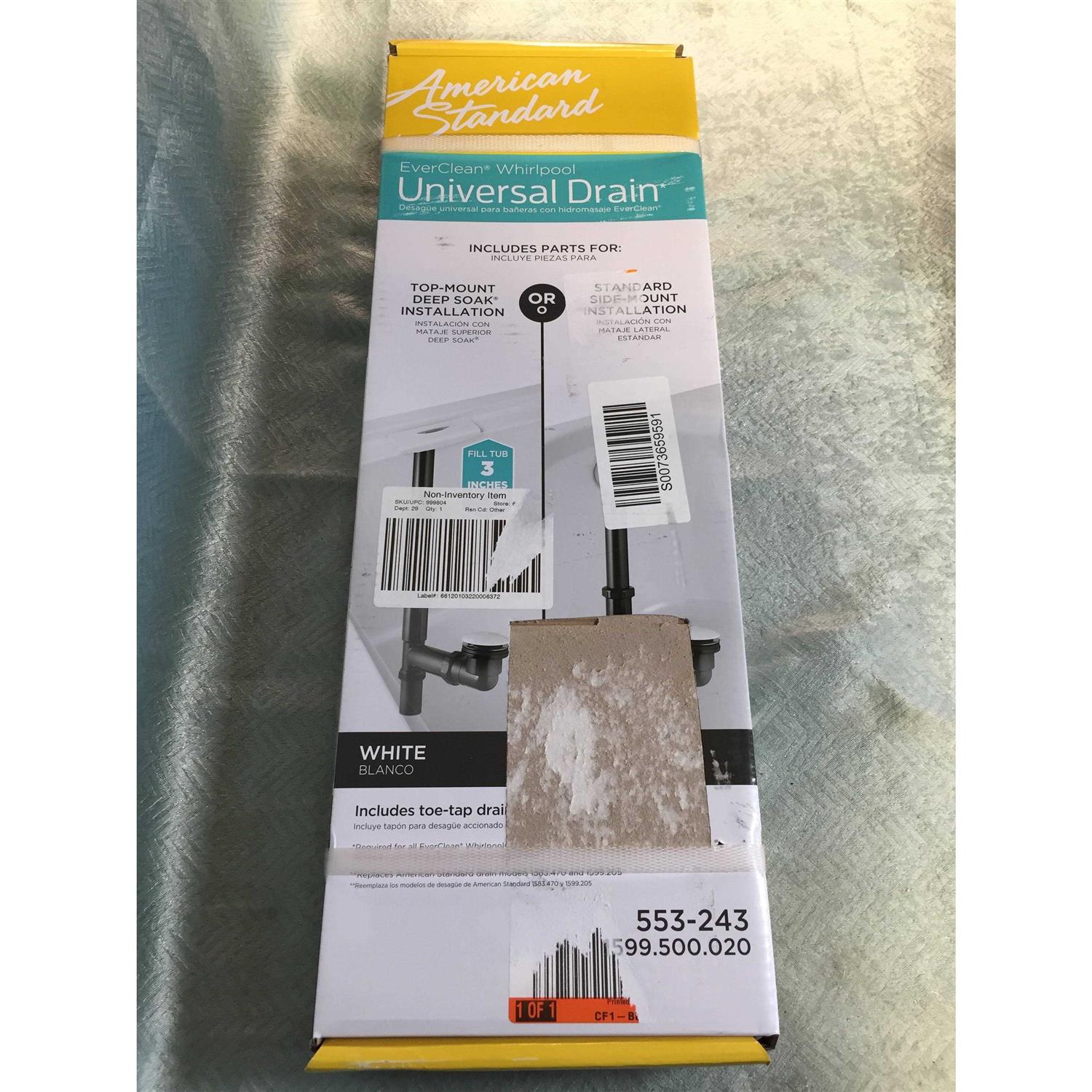 The unique overflow design facilitates a 2-3 in. deeper water level than conventional drains and eliminates the wasted space above a standard overflow cap. It’s easy to install and use. Toe tap stopper for added convenience Unique drain for complete full body immersion Two overflow covers ABS construction Designed for Everclean, Champion and Evolution models (sold separately) The top mount drain (left) and side mount drain (right) have the same model number, 1599.500 — New In Box Condition. Box will show tears wears or damage.