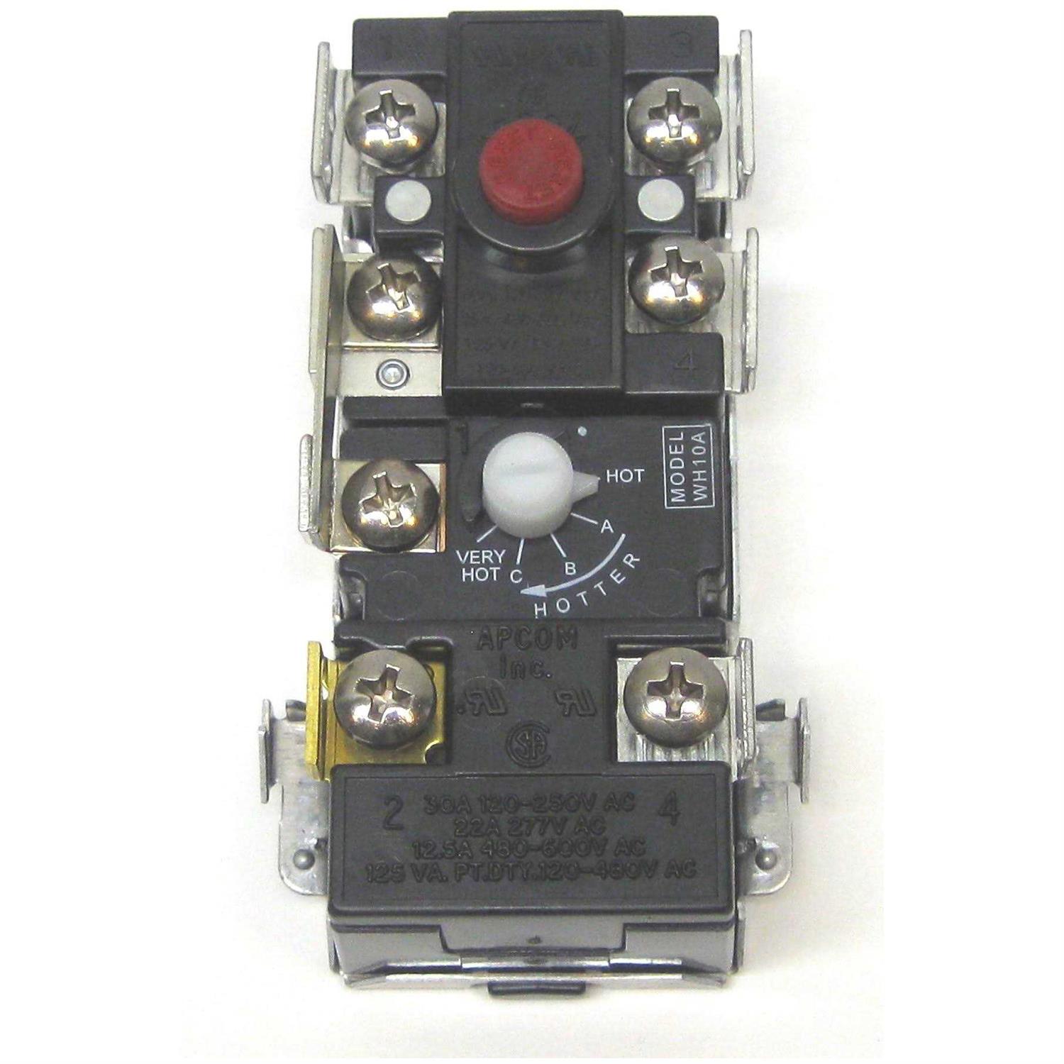 Water heater thermostat number wh10a. Temperature range 110-170f. With adjustable slotted knob. Has hi limit reset button l180. Designed to be used with the upper heating element of the water heater. Engineered to be more sensitive and accurate than conventional thermostats, apcom water heater thermostats are the most popular in the industry. Our patented design encapsulates the bimetal thermostat sensor, protecting it from the temperature changes of other components. This feature means you get a thermostat with enhanced temperature sensitivity for accurate, reliable system control. Our wiring terminals feature tear drop holes that enter into the bind head screw terminal, making it easier to lock the wire into place. This speeds the assembly process, and helps ensure that connections are made properly. In addition, our limit control/safety override feature automatically trips at 180 degrees to improve safety. Replacement for thermodisc number wh6-4.