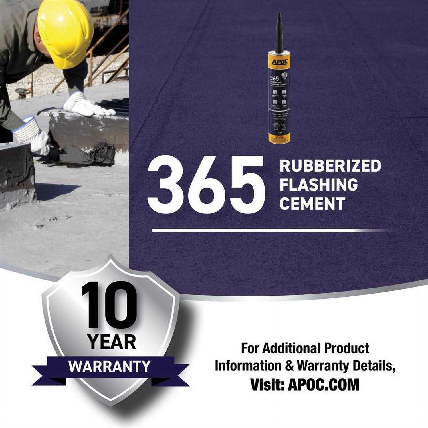 Protect your roof against the elements with APOC 365 Eterna-Flash All Weather Rubberized Flashing and Roof Cement. Designed for all-weather application, APOC 365 bonds to wet surfaces, easily bonds underwater and is ideal for temporary and permanent repairs. With an extremely versatile modified mastic, APOC 365 adheres to spudded gravel, mineral surfaced cap sheets, smooth surface asphalt roofs, most APP and SBS membranes and shingle roofs. Apply cement 0.125-inches thick, reinforce the repair by adding a layer of APOC reinforcing fabric and cover the fabric with an additional layer of cement. Follow all directions on label for application. Packaged in a 10-ounce tube for exterior use only. Brand Name: APOC Sub Brand: Eterna-Flash Sheen: Gloss