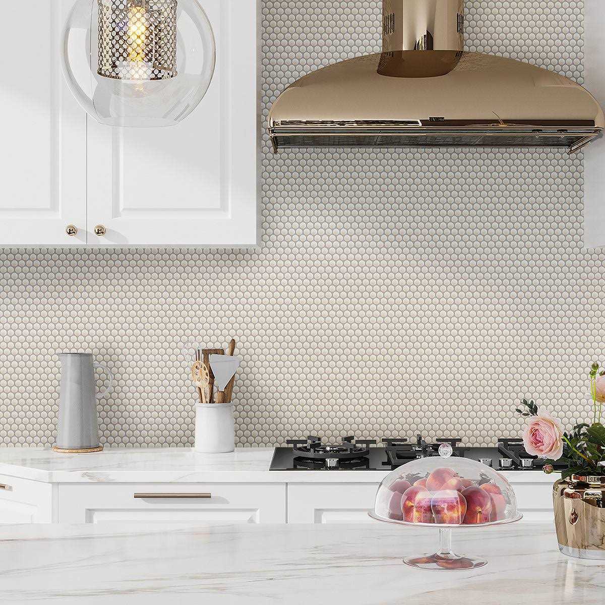 A penny tile mosaic design is one of the most popular ways to integrate retro vibes into your home! White penny tile is a classic and timeless option that offers up endless opportunities in interior design. You can use these coin-shaped mosaic tiles in the living room on a statement wall, as a penny tile backsplash for your kitchen or bathroom, or as a shower flooring that is stylish and functional. Looking for a timeless geometric look on your floors? Well, these white porcelain tiles will do the work for you. They work beautifully as a tile rug or to cover the entire flooring with an impervious finish. Resistant to stains and water, porcelain surface does a great job in handling common spills and splashes. Styling these penny-round tiles can never go wrong in the industrial, modern, contemporary, and even coastal interior design styles. To create an atmosphere of contrast, pairing white penny tile with dark grout will highlight the shape of the tiles and create a truly visual delight!