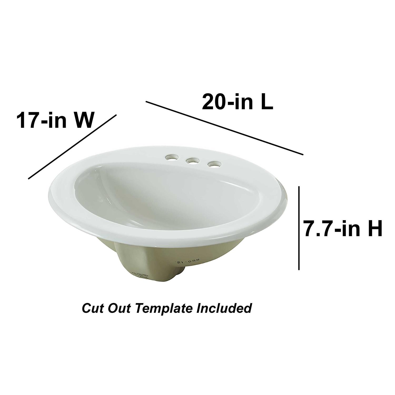 The self-rimming design creates a striking focal point in your room. This sinks generously sized oval basin creates a striking design element that works with both contemporary and traditional bathroom styles. Constructed of durable vitreous china that resists chipping scratching and fading. High-gloss nonporous surface keeps its shine for years of enjoyment. Pre-drilled 4 inch centers for installation of a matching faucet not included. Integral front overflow drain.