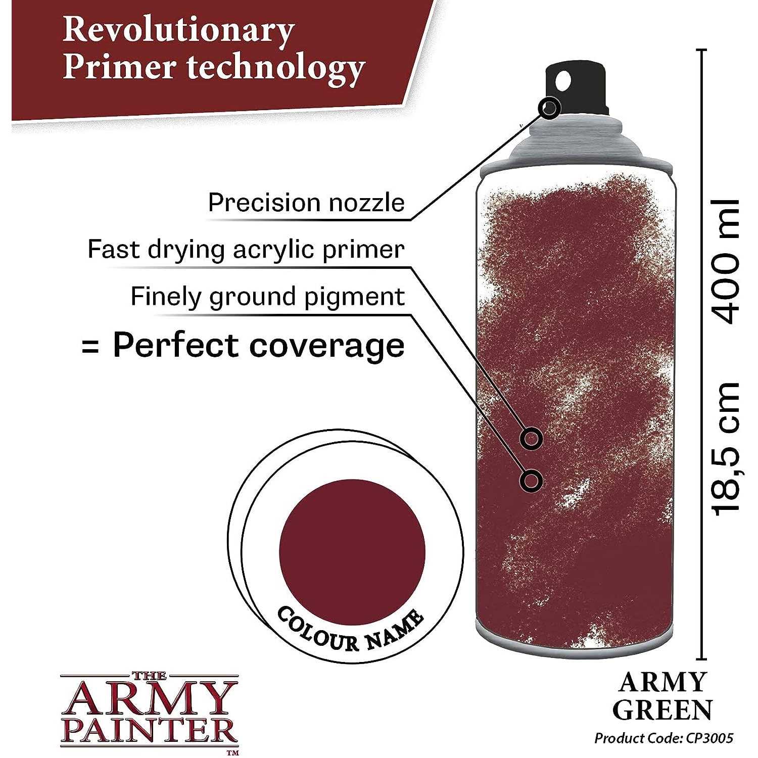 An ingenious combination of primer and color spray in one. Save both time and money! No need for two different sprays – all you need is one Color Primer Spray for perfect results. The 400ml army-sized aerosol can gives you plenty of spray paint to prime even a large army.The Army Painter Color Primers Sprays unique formula has been designed to be used on all metal, plastic and resin miniatures. The surface finish of the Color Primer Sprays dries perfectly matt, designed for further painting with our acrylic Warpaints and Quickshades. Owing to the extra-fine pigment and special spray nozzle, the Color Primer Sprays ensure great coverage with just one layer. Quality acrylic spray primers for any Warhammer, roleplay, boardgame or Dungeons & Dragons miniature painting hobby project. Using The Army Painter Color Primer Sprays can save you loads of time. Dont paint on your dominant color using a brush – spray it on instead! Ordinary primers are specifically designed to go under the paint and regular color sprays are intended to cover a primer coat. The Army Painter Color Primers are both primers and paints! The Army Painter is all about getting your army painted and on to the tabletop, gaming! Nobody enjoys playing with or against an unpainted army. By using Color Primer Sprays in conjunction with our Quickshades, getting your army fully painted has never been easier. For your most dominant color, choose between a wide range of 23 different Color Primer Sprays, clearly marked by the color circle on top of the lid.