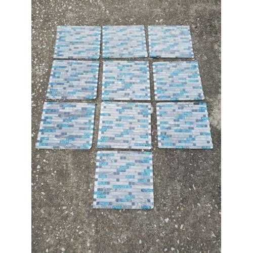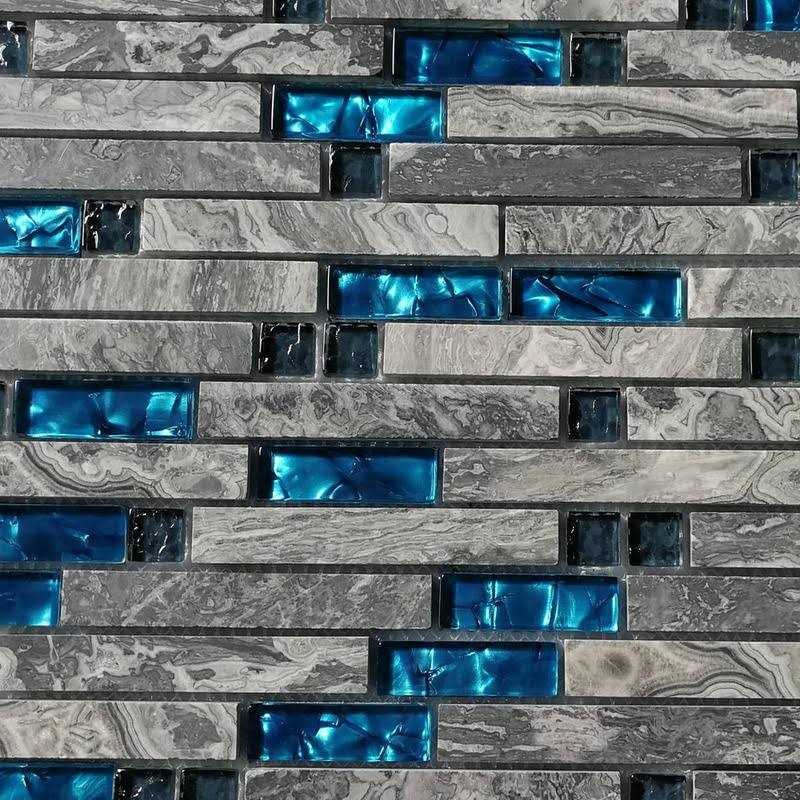 This new stone glass tile is designed interlocking match consist of blue crystal glass and grey Nature Stone. The surface has been polished to glossy while allows it to be gorgeous. The blue glass chips is made with the combination of premium vinyl blue substrate and crystal glass. The glass is come out from a high-temperature process which makes it having strong impact no fragile. The color will never fade. The tile is suitable for kitchen backsplash accent walls bath and shower walls swimming pools.