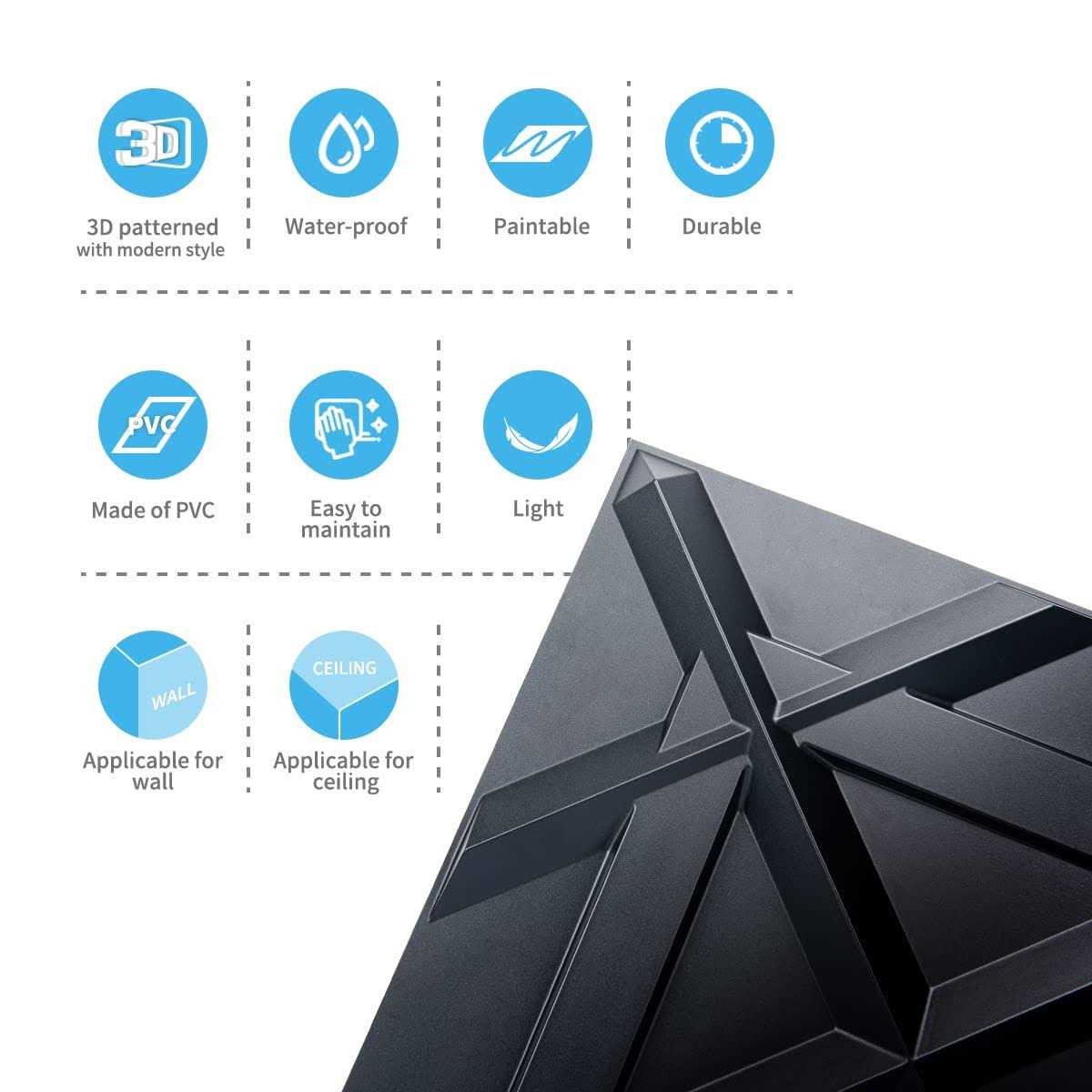 Art3d PVC 3D Wall Panel, Decorative Wall Tile in Black 12-Pack 19.7″x19.7″