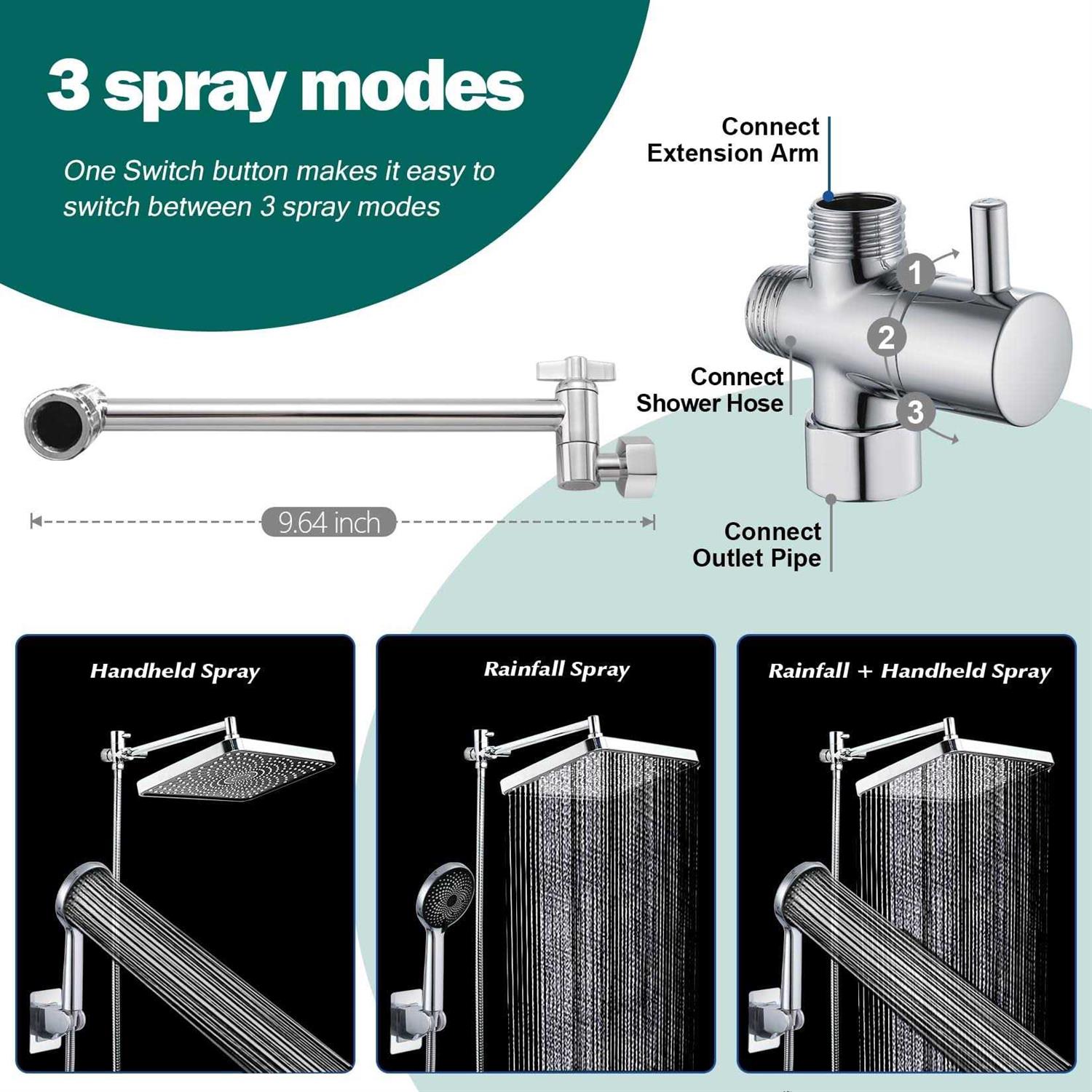 【14” Super Large Rain Shower】The waterfall-style large square shower covers the whole body. 360 rotation angle-adjustable solid ball joint nut for reliable leak-free connection and different angle position shower needs. Come with filter and washer insure reliable leak-proof connection. Using ultra-thin design and advanced air booster technology, offer superior rain spray shower experience even at low water flow and pressure. 【3 Speeds Handheld Shower with Spray Mode】The handheld high-pressure shower has 3 spray modes: power rain, gentle rain, intense rain. Chrome face handheld shower head looks more beautiful and generous. Specially designed built-in bathtub and tile powerful wash mode. Gently rotate the handle on the shower panel to switch to other modes. It is a good helper for removing dirt, soap scum and dried hair. 【11” Brass Adjustable Extension Arm】Keep the shower head away from the wall. Made of sturdy and durable brass, there is no need to worry about cracking or leakage. 180 degrees height & angle adjustable for satisfying different position shower needs and and bring you an excellent shower experience. 【Self-cleaning Nozzle & Waterproof Hose】328 soft silicone nozzles can prevent lime scale build-up for maintenance-free enjoyment, resistant to clogging, easy to clean, anti-oxidation and corrosion resistant. Unlike other cheap shower heads with hoses, our high-pressure shower heads are equipped with 6 ft long stainless steel hoses. Special woven material is used inside, which is completely waterproof. 【Easy to Install and Accessories】Please refer to the installation pictures or manuals inside the page. Use all standard 1/2” pipe threads. It can be installed in minutes and requires no handyman. In addition, it contains two hooks, spare silicone nozzle, gasket and filter.