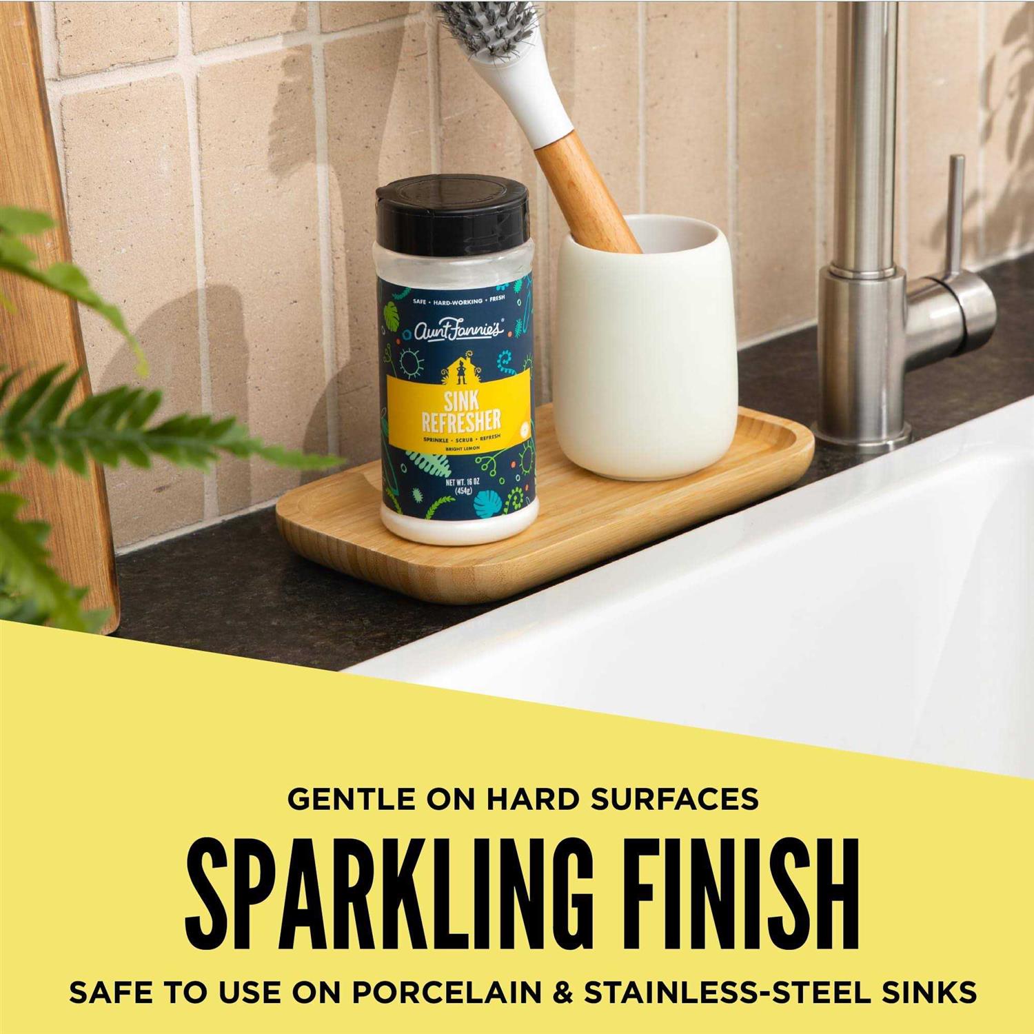 Aunt Fannie’s Sink Refresher: Lemon scented powder packed with the power of baking soda to scrub away stubborn food, grease and stains while also deodorizing sinks & drains Gentle on Hard Surfaces: Safe to use on porcelain & stainless steel sinks just lightly sprinkle over sink surface. Use a cloth or sponge to scrub away grease & grime. Rinse with water Multi-Purpose: Sink Refresher can also be used on pots & pans to remove stubborn food. Great for use in the bathroom on sinks, tubs, tiles & toilets and can help minimize trash can odors with a quick sprinkle Natural Ingredients: Aunt Fannie’s only uses natural ingredients with no harsh chemicals or heavy perfumes. Our formula is made with lemon, orange peel & peppermint oils for a fresh smelling sink Aunt Fannie’s Products: Try Aunt Fannie’s full line of natural, hardworking products including vinegar floor cleaners, multi surface vinegar sprays, carpet refreshers & pest control solutions Sink Refresher – Bright Lemon – 16oz – 2pk