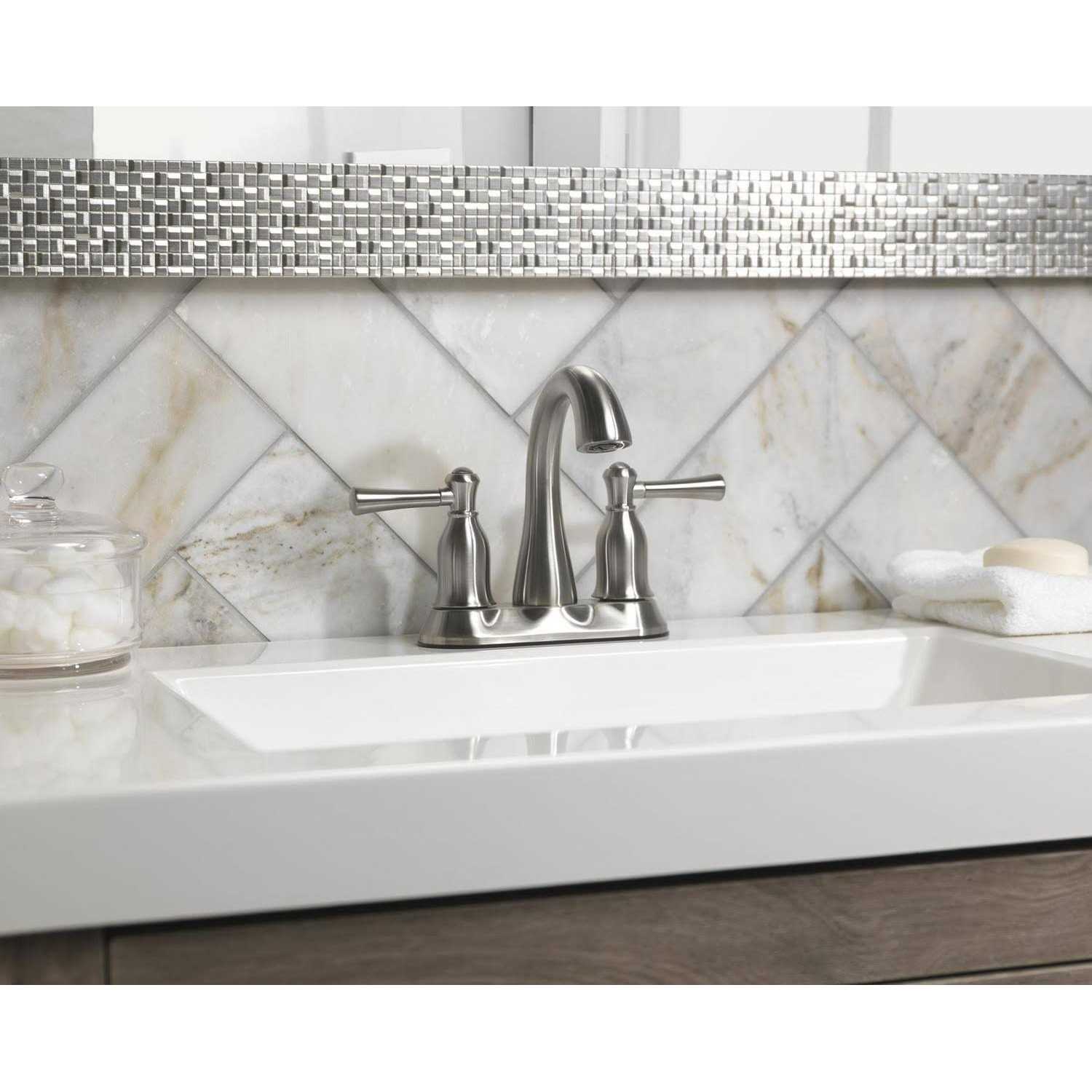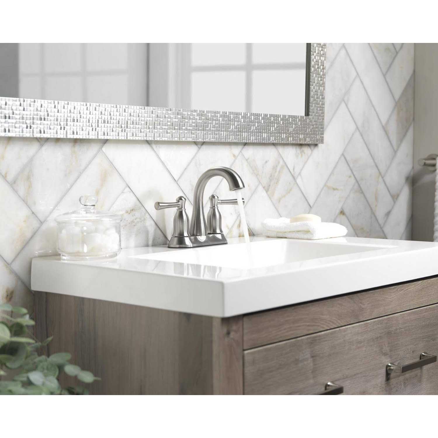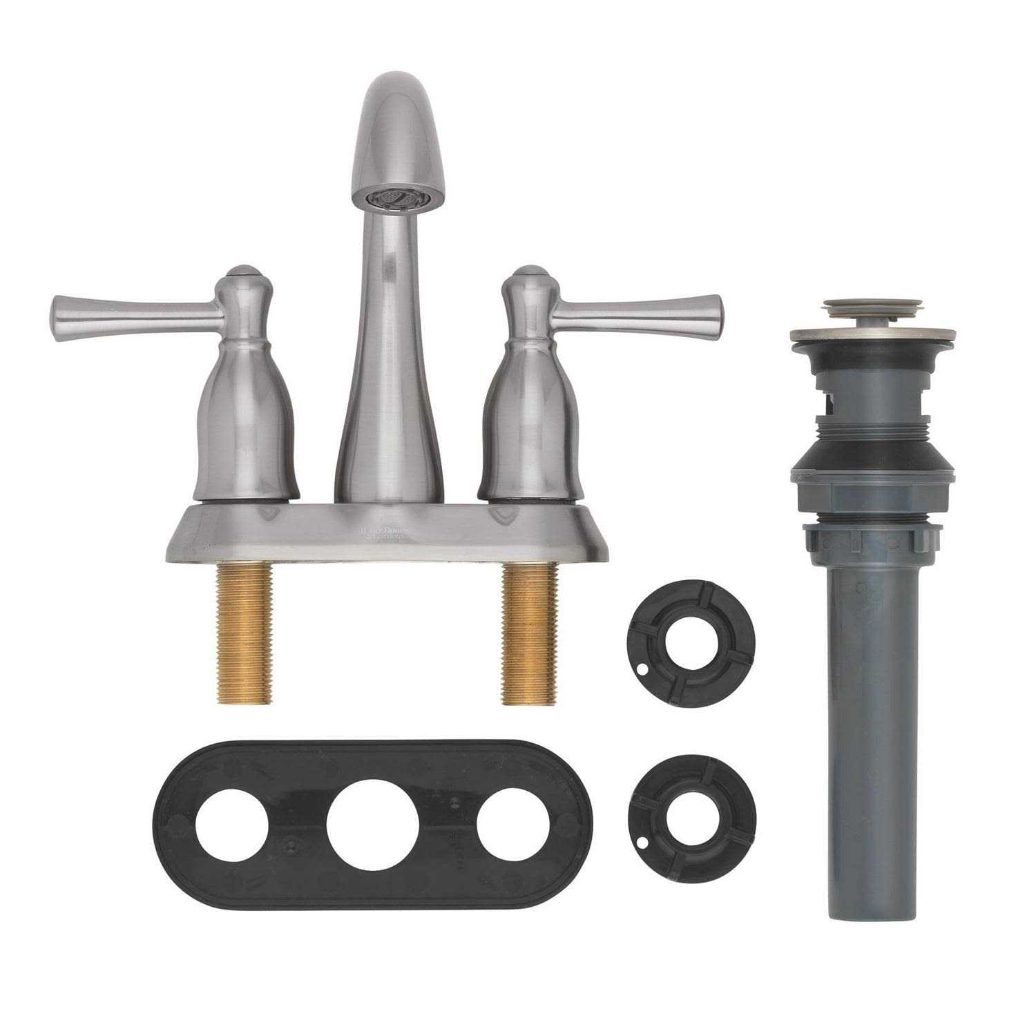 The Better Homes & Gardens Two Handle Bathroom Faucet in Satin Nickel from the Safford collection features a mid-rise spout and a detailed, contemporary look. This faucet has a 4-inch centerset design that installs onto 3-hole sinks. Complete the look of your sink with the included, matching pop-up drain assembly. The dual lever handles are ADA compliant allowing you to adjust temperature and pressure easily.
