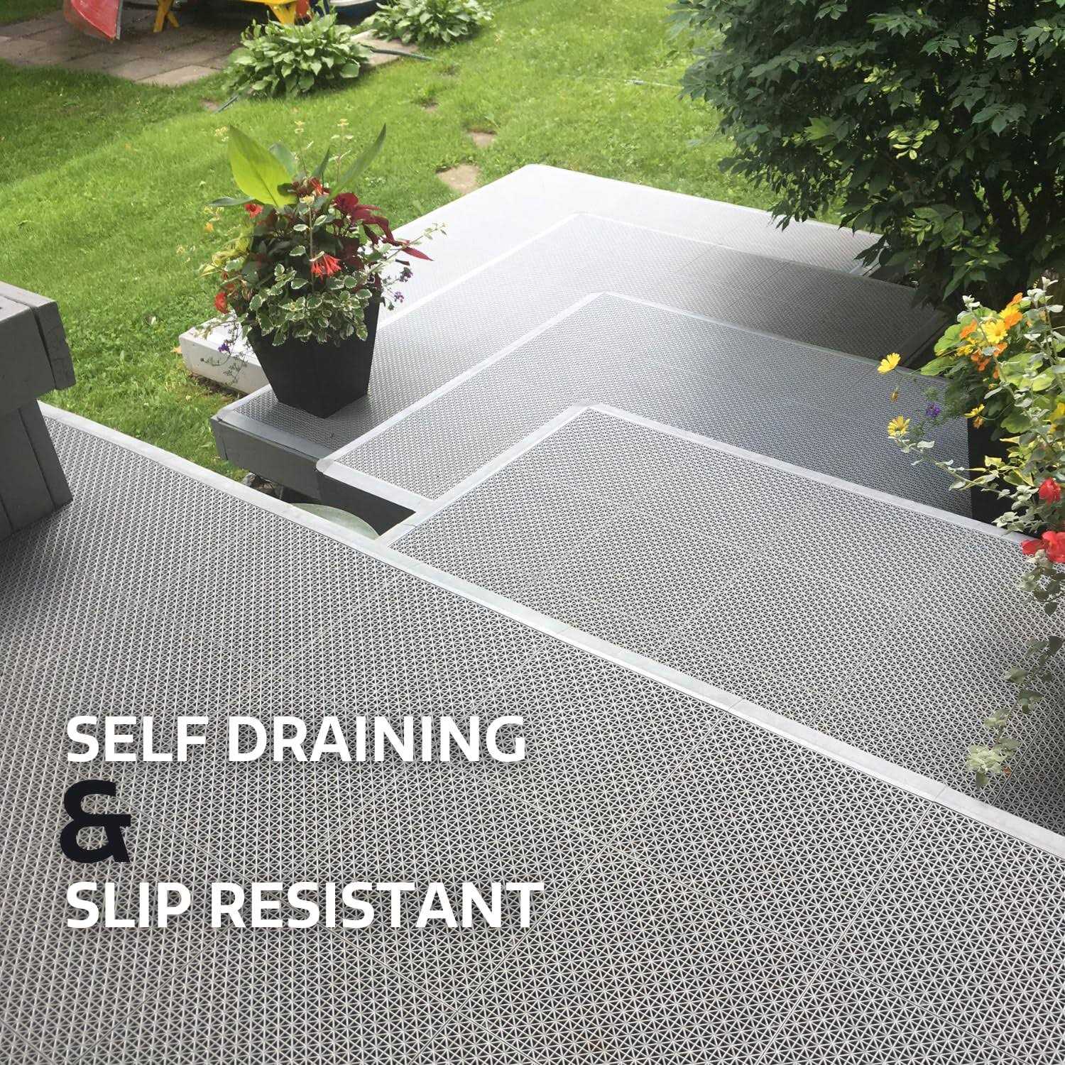DuraGrid outdoor deck tile is the original outdoor modular patio flooring. Our deck tile self-draining surface is designed to withstand extensive UV exposure and excessive use. Features: DuraGrid outdoor deck and patio flooring is designed to withstand extensive UV exposure and high foot traffic. Each tile is anti-microbial to fight mold, mildew and bacteria Perfect accessory to any outdoor area. Front entry, mud room, deck or patio. Use around hot tubs and saunas for added comfort and safety Simple setup, no toxic fumes. Tiles simply “snap” together to create any size, perfect for covering slippery concrete or wood surfaces. No tools or glue required. Resists most common chemicals Non-slip and slip resistant. DuraGrid is great for many applications such as around the pool or to cover unsightly concrete or worn decks Easy to clean, low maintenance flooring. DuraGrid tiles can simply be sprayed down with a hose without hassle or worry. It’s self-draining feature eliminates water problem areas.