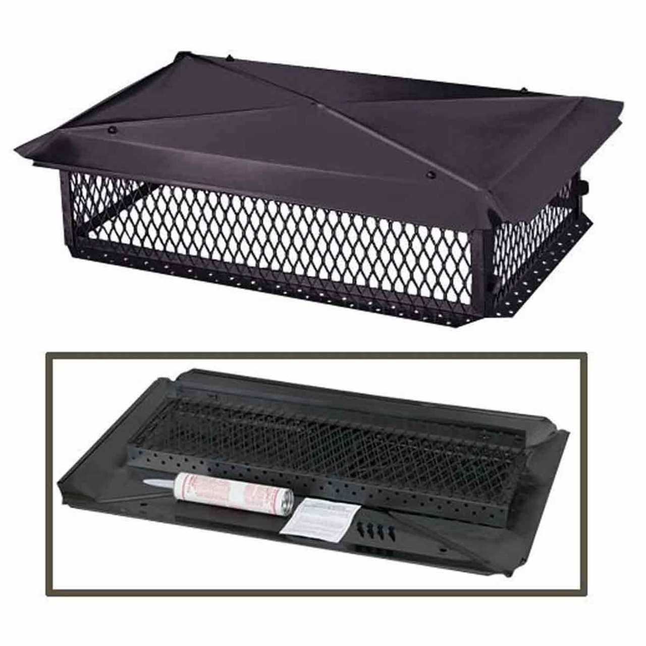Attractive chimney cap for multi-flue masonry chimneys. Measures 14-in x 30-in from screen to screen; requires a 17-in x 33-in masonry chimney top for 24-gauge galvanized steel base flanges to mount properly; hood measures 22-1/4-in x 34-1/2-in. 24-Gauge removable galvanized steel hood with scalloped corners and roll-formed edges allows for extra strength and easy cleaning. Made with 18-gauge 3/4-in galvanized steel expanded metal mesh. Attractive black powder coat finish helps it to stand up to the elements. Top-mount design attaches easily and securely with included tap mark masonry screws and tube of all-weather construction adhesive. Acts as a spark arrestor to prevent most ascending sparks from reaching the outside. Not recommended for use in situations where oil or coal is burned or when wood/pellets are used as primary source of heat. Made in the USA.