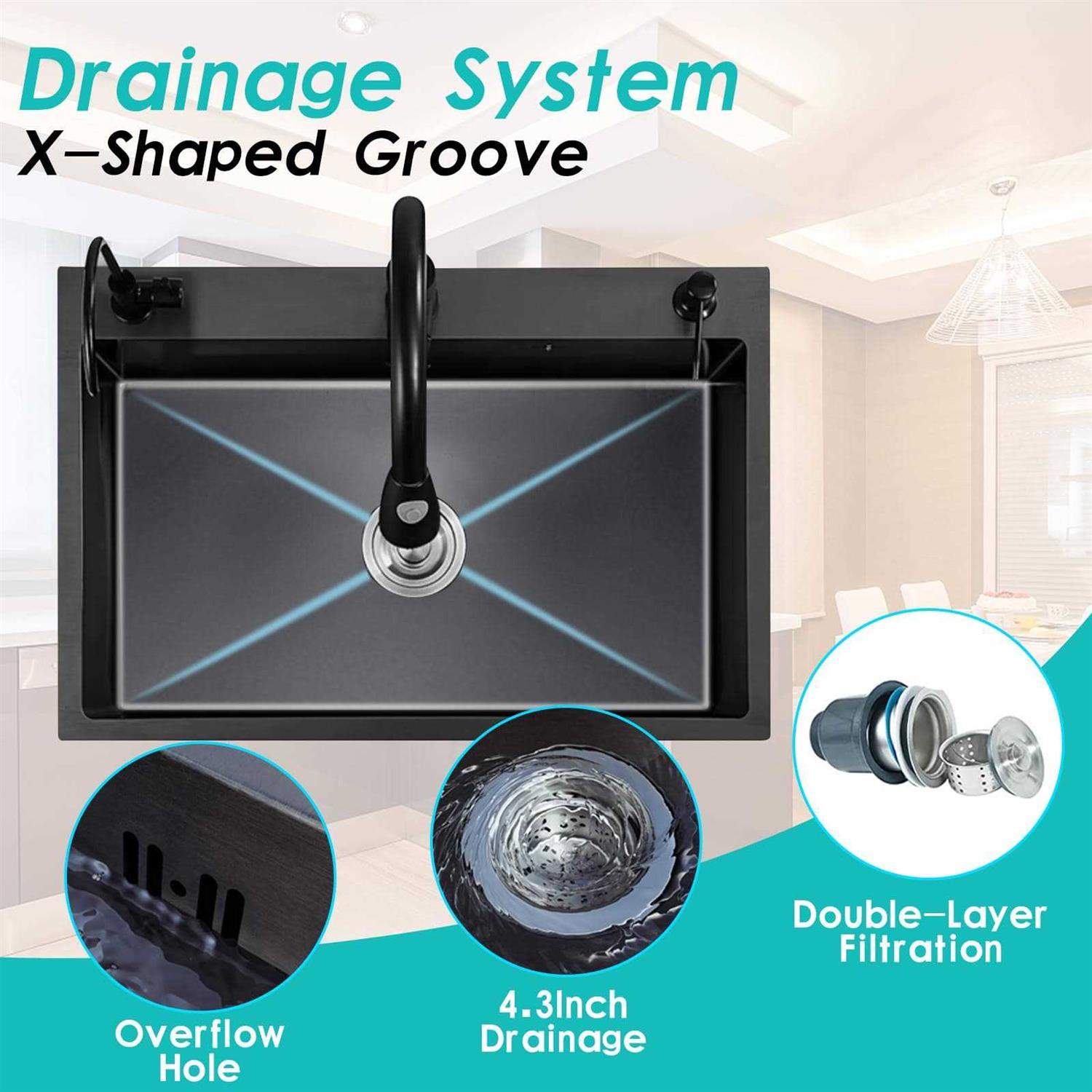 Black Kitchen Sink: 11 gauge SS kitchen sink come with gift – stainless sink bottom grid, black soap and lotion dispenser pump, retracable strainer basket and drain assembly set. With sleek design and gift, drop in kitchen sink combines style and functionality effortlessly, nice addition to any contemporary kitchen. SS Kitchen Sink Dimension: With Exterior dimensions-15.7″Wx19.7″Lx8.3″D, Interior dimensions-11.8″Wx17.7″Lx8.3″D, single bowl kitchen sink could be advantageous for smaller kitchens or spaces. With R10 round corner topmount kitchen sink could provide ample space for everyday kitchen tasks, such as washing dishes and preparing food. 3 Hole & Overflow Hole: Three pre-drilled faucet holes of single basin kitchen sink provide flexibility in choosing and installing various faucet styles, allowing you to customize your sink to suit your preferences. Overflow hole of topmount sink directs excess water into the drainage system, maintaining a clean and safe kitchen environment. Surface Technology: Made from stainless steel with brushed finish and nano coating, black kitchen sink is built to last. Suface technology of ss kitchen sink resistant to corrosion, stains, and scratches, ensuring its durability even with heavy daily use. Anti-condensation spray undercoating also helps prevent condensation buildup on the underside of the sink. X-Shaped Bottom Design: The X-shaped groove design of stainless steel kitchen sink could provide multiple drainage channels, allowing water to flow more effectively towards the drain. Bar sink with this design also help prevent water from pooling in the sink, making it easier to keep the sink clean and dry. kitchen sink,bar sink,single basin kitchen sink,top mount kitchen sink,stainless steel kitchen sink,drop in kitchen sink,ss kitchen sink,single bowl kitchen sinks,modern kitchen sink