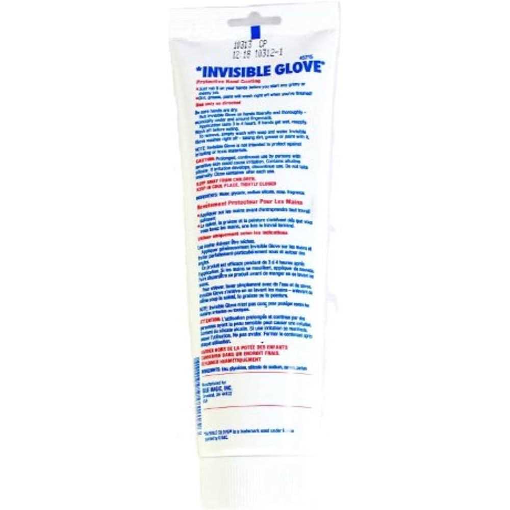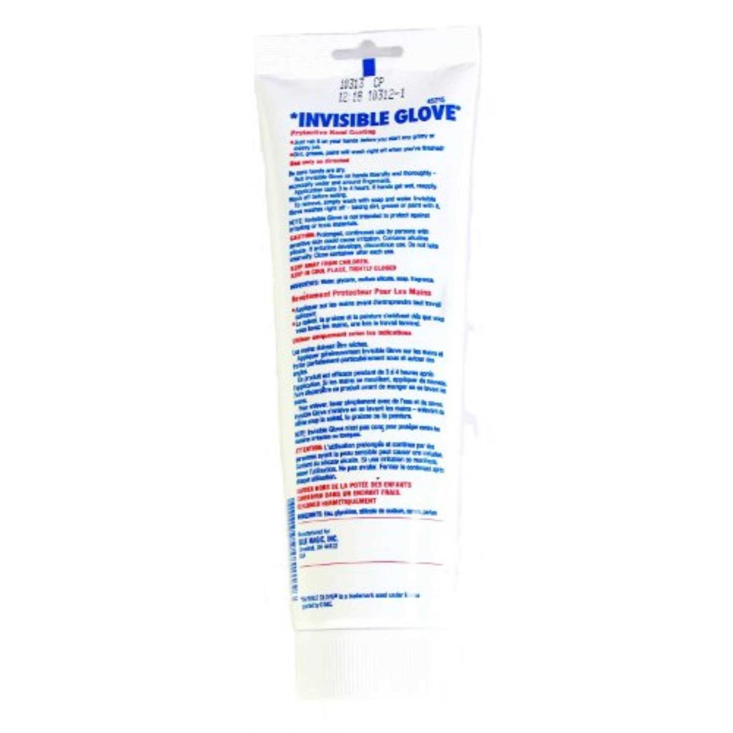 Invisible coating protects hands, including pores, cracks and fingernails, from grease, oil, dirt, paint and chemicals. Non-greasy; improves grip on tools. A great accessory for crafts, home improvement and more. Easy clean up, just soap and water. Contains no harsh or dangerous chemicals. The Blue Magic Invisible Glove is a protective hand coating which makes it easy to wash dirt, grease and paint off hands. Application typically lasts 3 to 4 hours and if hands get wet, it can be reapplied. To remove, simply wash with soap and water, and the invisible glove washes right off, taking dirt, grease and paint with it.