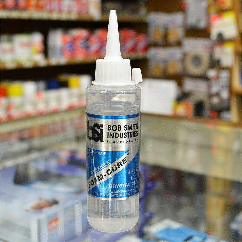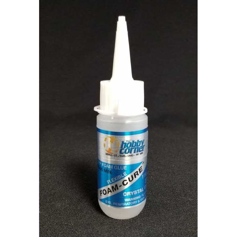 Foam-Cure is a silicone based adhesive for EPO and EPP foams. It cures clear and slightly flexible, but it does not bond instantly like CA glues. There is also no accelerator for this adhesive. You can speed adhesion by applying to one piece, fitting the two pieces together, and then pulling the pieces apart for about 10 minutes. When you fit the parts together again, the joint will be tacky and adhere well. Full cure time is 10 – 12 hours. In addition to foams, Foam-Cure will bond wood and plastic to foams, and is also a good canopy glue. While it is somewhat flexible, it is not flexible enough to act as a hinge for control surfaces, and it does not work well on large areas of non-porous contact surfaces. Foam-Cure cures when exposed to air, so some surface porosity is essential to allowing the solvent to evaporate. Foam-Cure can be thinned with denatured alcohol.
