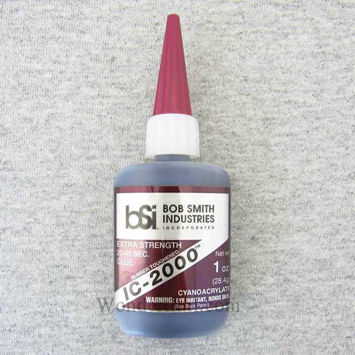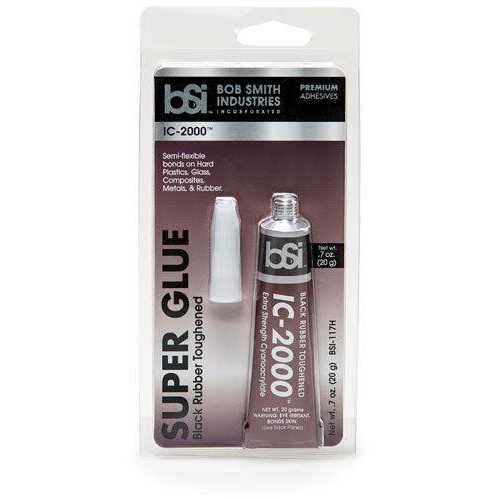 BSI118 IC-2000 Rubber-Toughened 1oz CA Adhesive Glue Bob Smith Industries IC-2000 is a rubber-toughened cyanoacrylate that forms superior shock resistant bonds on non-porous surfaces. The black colored CA has added flexibility for the bonding of metals, fiberglass, rubber, carbon-fiber and other advanced materials. For model use, IC-2000 is ideal for the bonding of bulkheads, formers and servo rails to the inside of fiberglass hulls and fuselages. Setup time is 20-40 seconds, which can be accelerated with INSTA-SET. When cured, IC-2000 is pliable enough to be carved with a hobby knife. IC-2000 is the best adhesive for R/C car tires. A very thick, rubberized super glue.