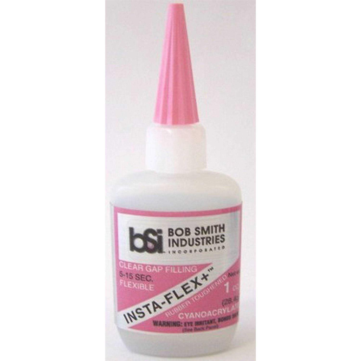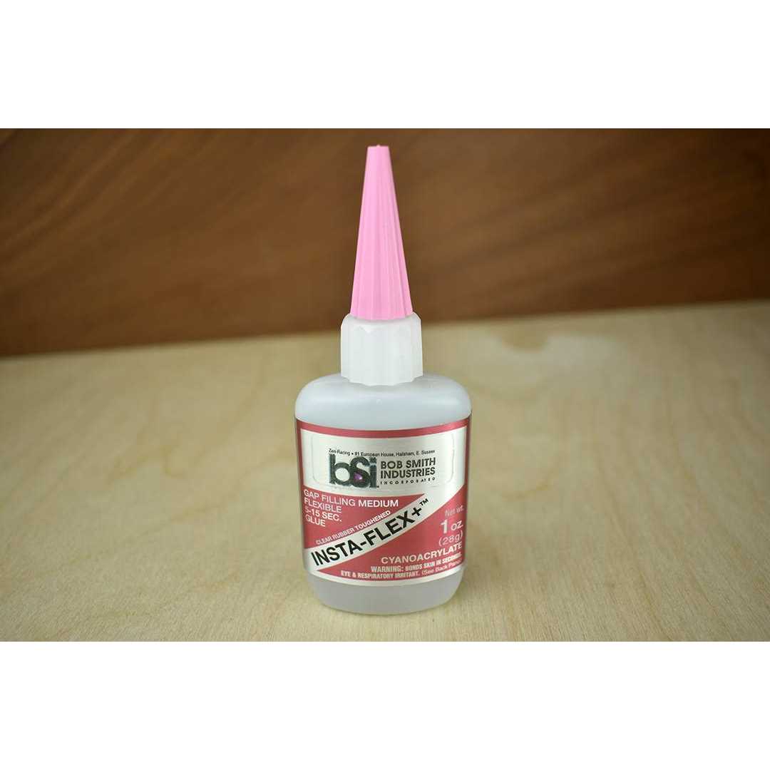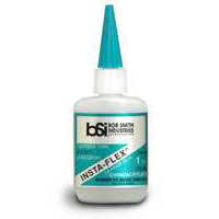 This is a one ounce bottle of Bob Smith Industries INSTA-FLEX+ Clear Rubber Toughened CA Glue. INSTA-FLEX+ clear rubber toughened has similar qualities to our black IC-2000 but can be used in applications where you do not want the adhesive to be seen. The carbon component of IC-2000 that gives the CA its black color also contributes to its unsurpassed strength. Since INSTA-FLEX+ has this carbon removed, its strength is a little less than IC-2000 but still superior to standard CA’s. When esthetics are important and a flexible bond is required, INSTA-FLEX+ is your best choice. It forms superior bonds to soft urethane and vinyl plastics. Both INSTA-FLEX and INSTA-FLEX+ work well when bonding R/C car tires. When a joint has a larger than normal gap, flexible CA’s provide superior shock resistant bonds.