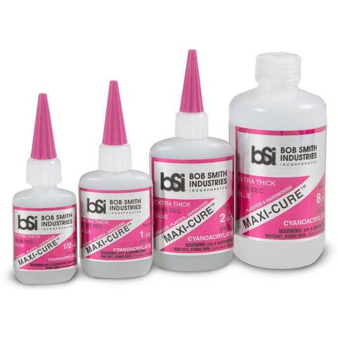 Maxi-Cure extra thick CA is the best CA for most plastics, including GE’s Lexan MAXI-CURE is the best choice for plastic model assembly. When used with INSTA-SET , it works better than any putty for modifying or filling voids. It can be carved with a knife or razor blade and sanded and feathered to form a finish indistinguishable from plastic. MAXI-CURE bonds fiberglass, hardwood, metal and rubber better than any other hobby adhesive. For gluing to the inside, clothtextured surface of fiberglass, scrape the area to be bonded with a razor blade or coarse sandpaper before using MAXI-CURE or any other adhesive. It also is best for bonding the tires for R/C cars.MAXI-CURE has proven to be very popular in the archery business for the fletching of vanes onto aluminum and carbon arrow shafts. Along with being the strongest, MAXI-CURE is usually the least expensive option for this application. Unscrew top from nozzle. For finer applications, use the extender tip. Apply Maxi-Cure CA to one side of the parts being joined, then hold them tightly to- gether for 10-20 seconds. For larger bonding areas, apply serpentine beads of the CA with enough spacing to allow for the spreading of the adhesive. Insta-Set accelerator can be sprayed to cure the CA that oozes from joints. Full strength is reached in three hours. Wipe the nozzle clean before replacing screw-on top. Refrigerate to extend shelf life. Cured CA is stable from -40 to 220° F. Soak extender tip in acetone for cleaning. WARNING: This product can expose you to chemicals, which is known to the State of California to cause cancer.