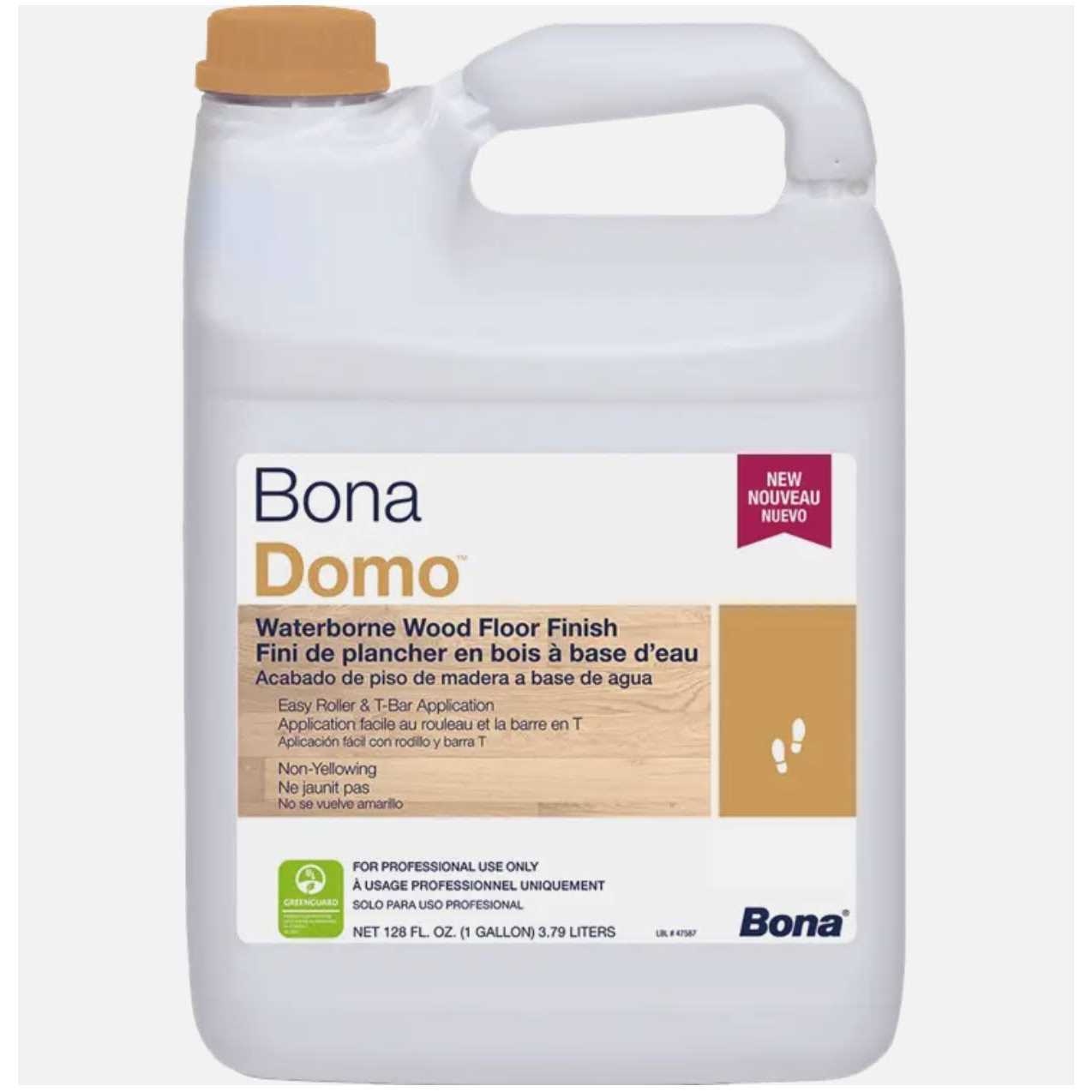 Bona Domo is the newest member of the Bona family of finishes. This easy-to-use residential, light traffic waterborne finish is easy to abrade and has a quick drying formula. Easy and forgiving to apply with a roller or T-bar, this one-component, nonyellowing formulation comprises all essential properties for finishing and protecting wood floors. And because it’s waterborne with low VOCs, Bona Domo provides a healthy environment. Bona Domo is GREENGUARD Certified. Apply with Roller or T-bar Forgiving/Easy Application Easy to Abrade Non-Yellowing Formula Low Odor GREENGUARD Certified Available in both Satin-Matte and Semi-Gloss