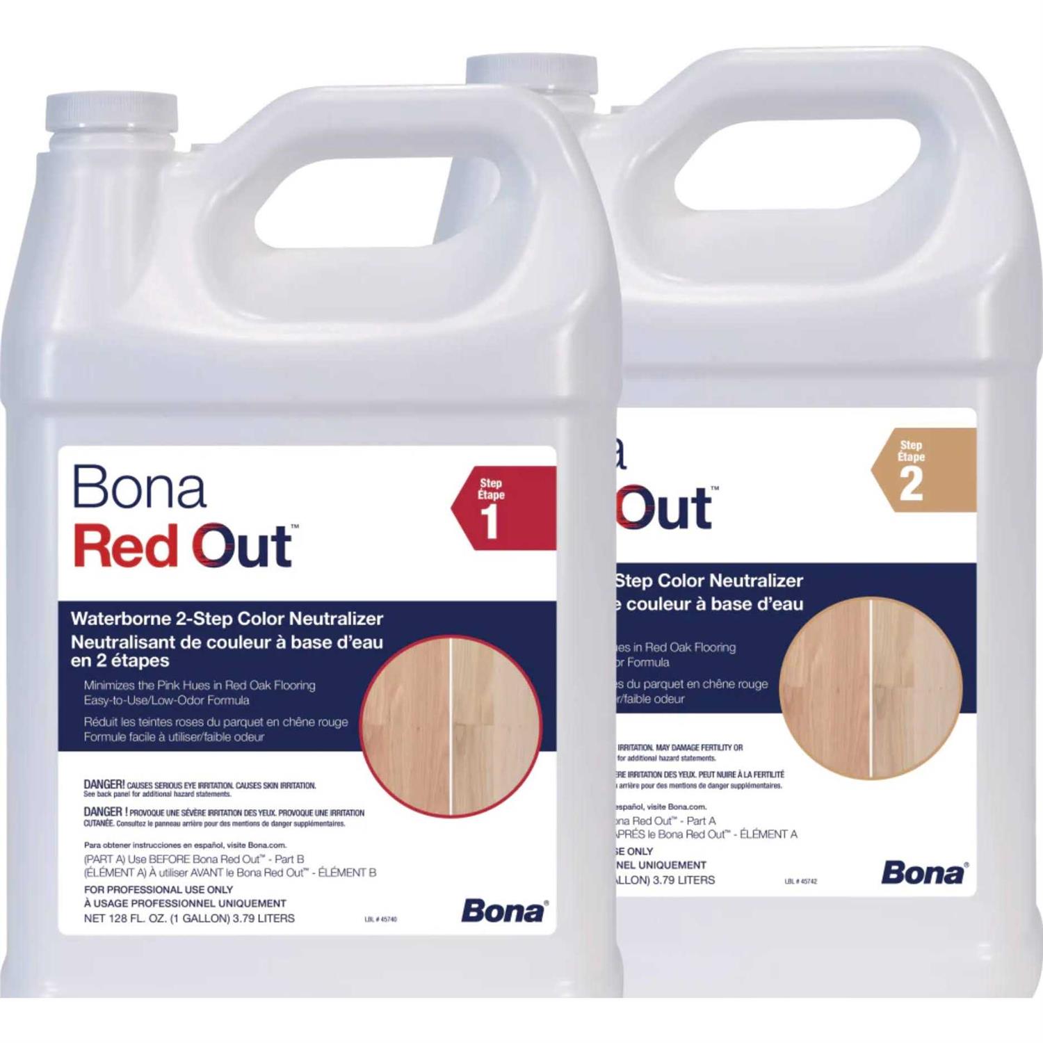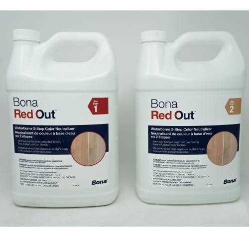 Minimizes the red/pink hues commonly found in red oak flooring Parts 1 & 2 Simple, easy-to-use 2-step process Compatible with the entire Bona Finishing System Quick drying, low odor formula No limited pot life and no wasted product Bona Red Out is a simple, easy-to-use solution to remove red and pink hues commonly found in red oak flooring and other wood species with red tones. Bona Red Out is a two-step waterborne color neutralizer designed to reduce red and pink tones to help mimic the look of white oak wood flooring. Bona Red Out is safe to use on multiple wood species from red oak to Brazilian cherry. This unique product is very low odor, dries quickly, and is compatible with the entire Bona System to allow easy preparation for staining, sealing, and finishing, making it the perfect first step to achieve lighter tones including a nordic look no matter the color or species of wood. Bona Red Out is safe for all residential and commercial flooring surfaces where a lighter, natural style is preferred. Because it is a waterborne product, there is also no need to water pop the floor prior to staining, saving valuable time. There is no pot life with Bona Red Out so there is minimal waste and it can be used across multiple jobs. Plus, the product can be diluted with water for easy customization to fit any project needs.
