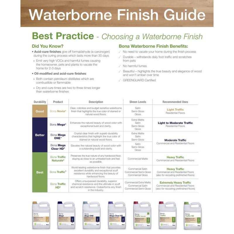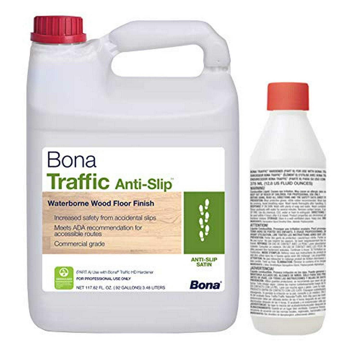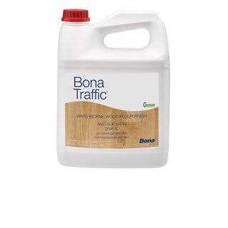 Bona Traffic is a waterborne, commercial and residential hardwood floor finish. It is the industrys premium finish for durability and beauty. Designed specifically for the unique demands of heavy-traffic commercial and residential hardwood floors, Bona Traffics advanced formula provides the ultimate in durability, outperforming any finish in the industry – moisture cure, solvent-based, oil-modified or other waterborne finishes. GREENGUARD certified for indoor air quality. Benefits Exceptional build with excellent flow and leveling UL Classified for slip resistance Excellent adhesion, recommended for recoating “prefinished UV” hardwood flooring Two-component, comes with hardener. VOC Compliant Recommended Uses Commercial and residential use shopping malls restaurants offices retail stores theater stages hospitals schools nursing home Recommended System Apply one Coat Bona sealer or Bona stain and 2 coats of Bona Traffic. Follow label directions. Adding a third coat of Bona Traffic is recommended in heavy-traffic commercial and residential areas. Coverage 350 to 400 Square Feet per Gallon Material: satin.