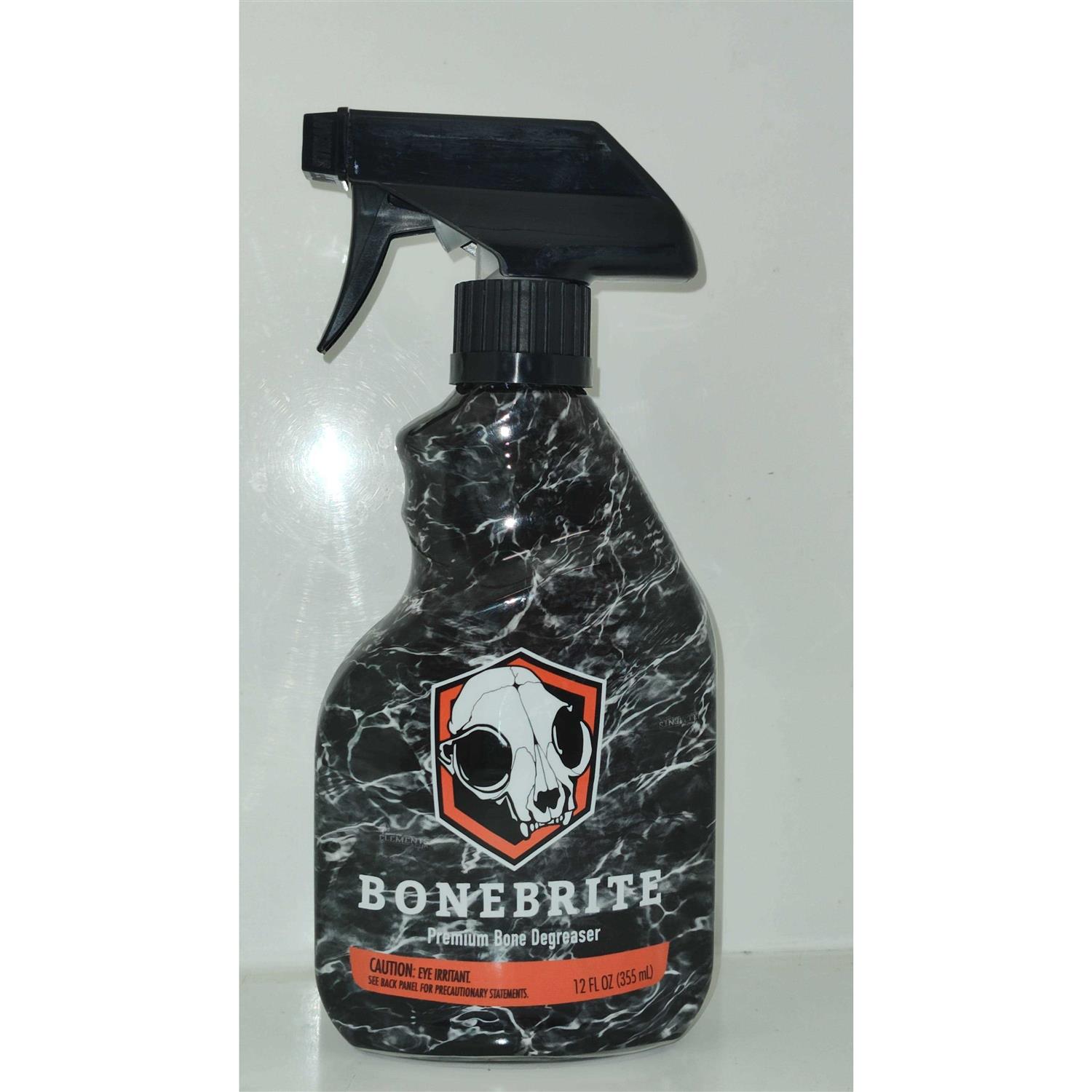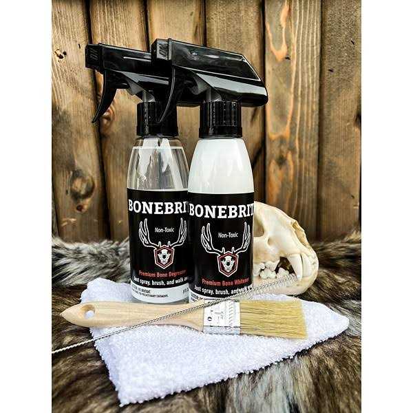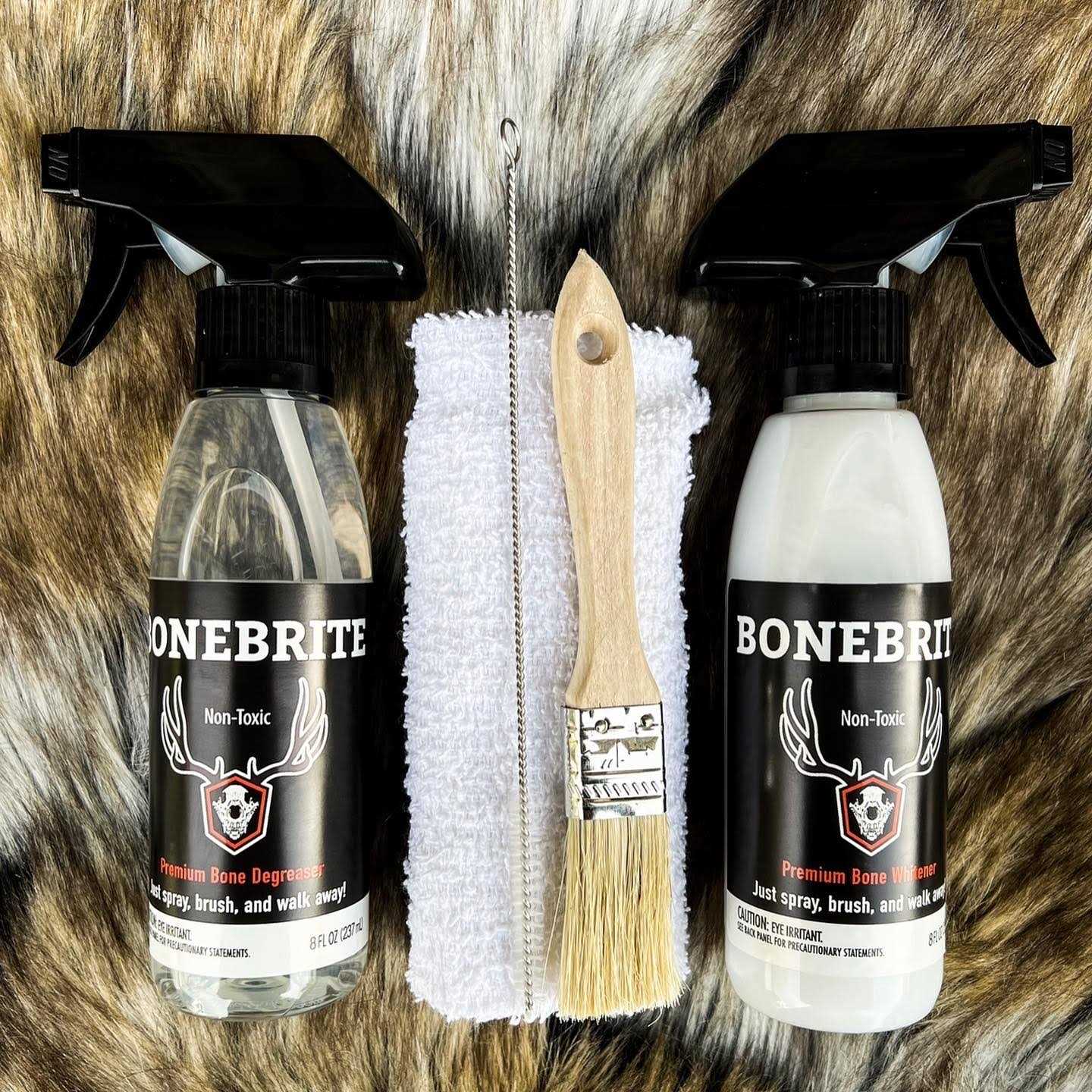 New Arrival! The easiest do-it-yourself skull whitening/degreaser kit on the market specifically designed to pull stubborn oil from bone! Just simply spray, brush, and walk away for unmatched results! Application Instructions Bone Degreaser Clean all meat and tissue off the skull using a sharp knife [not included]. Macerate the skull below 160°F – DO NOT boil. Boiling will crack the teeth and make the bone extremely brittle. Let the skull fully dry. Place gloves [included] on hands. Spray a liberal amount of the degreaser on the skull – anywhere bone is visible. With the 8 ounces provided, please complete two [2] applications approximately 8 hours apart. Allow the degreaser to fully dry overnight. Bone Whitener Place gloves [included] on hands. Apply BoneBrite whitening spray to skull – anywhere bone is visible – let sit for approximately 24 hours. The brush [included] can be used to ensure spray is evenly applied. After recommended whitening time, please wipe off any flakes with the towel [included]. Repeat step #2 for two [2] more applications, or until the desired whitening shade is achieved. *The brush [included] can be used to clean out cavities after whitening shade is achieved* For quicker, and more dramatic results, place skull/bone in direct sunlight after applying Premium Bone Whitener! Usage Chart for Coverage Amount of product needed will vary by size of skull. If applied as per instructions, 8oz will be enough for average sized elk skull. Ingredients Bone Degreaser: Hydrogen Peroxide, Phosphoric Acid, Alcohol and a blend of proprietary oils. Bone Whitener: Water, Hydrogen Peroxide, Cetearyl Alcohol, Ceteareth-20, Stearic Acid, Cetyl Alcohol, Phosphoric Acid, Alcohol and a blend of proprietary oils. Recommend Shelf Life: Two years from manufacture date. Warnings: Keep this product away from fire, heat, sparks, and electricity. Use only in a well-ventilated area. Close container after use. Store in a cool, dry place. Skin and eye irritant. Keep out of the reach of children. Avoid contact with eyes. Do not ingest. In case of eye contact, flush thoroughly with water. Call a physician if irritation persists. In case of skin contact, wash off with water. If swallowed, do not induce, seek medical advice immediately.