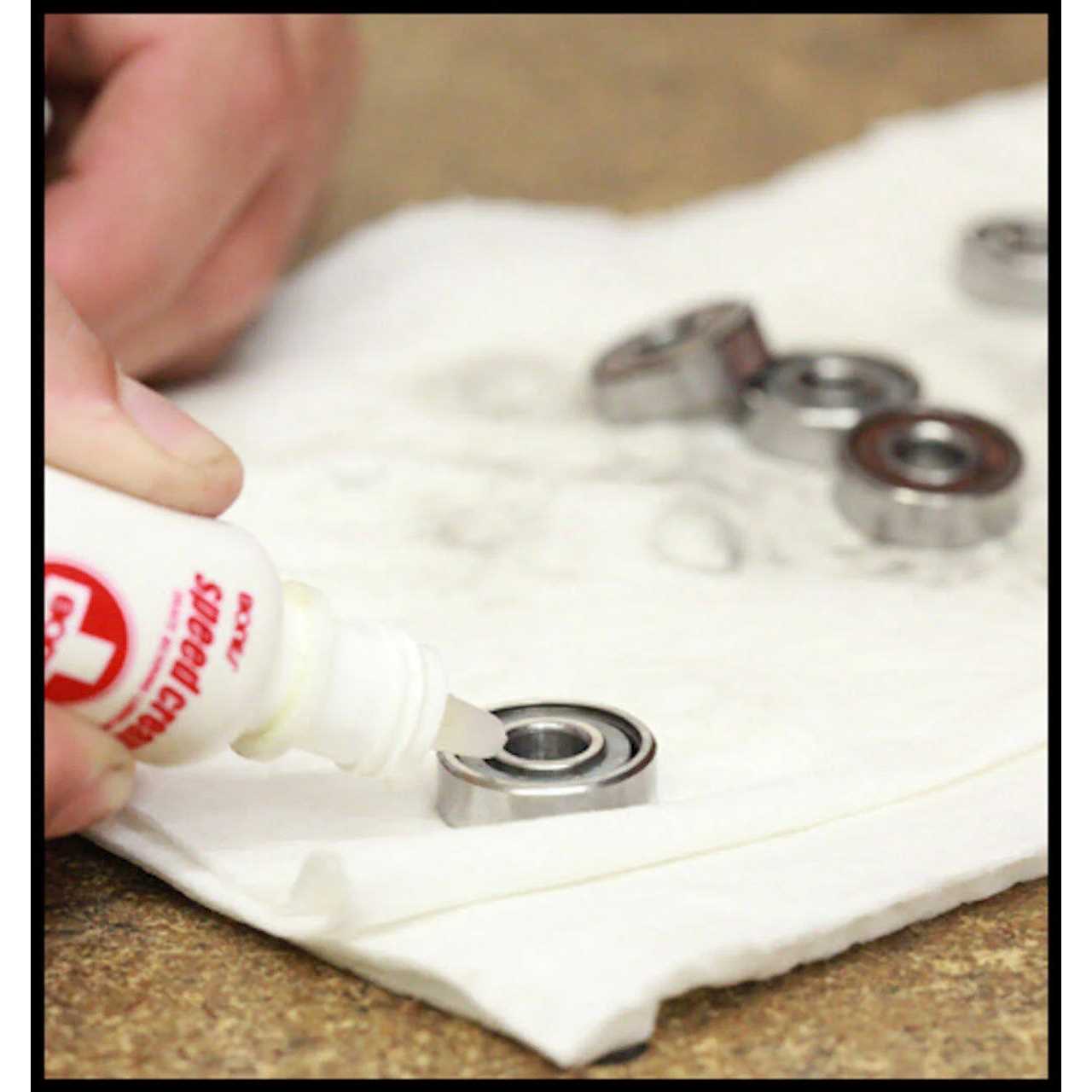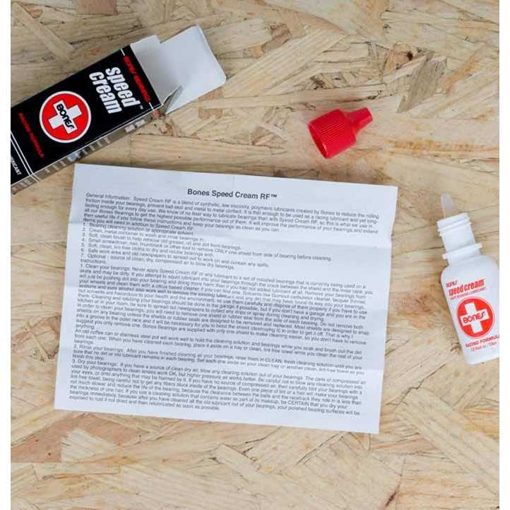 Bones Speed Cream is a high temperature, low viscosity synthetic skate lubricant specially formulated by Bones to reduce friction, and provide a durable micro film of lubricant to protect against corrosion. Bones has found this lubricant to be superior to Teflon based lubricants in skate environments. Speed Cream RF makes your bearings faster and is very long lasting.