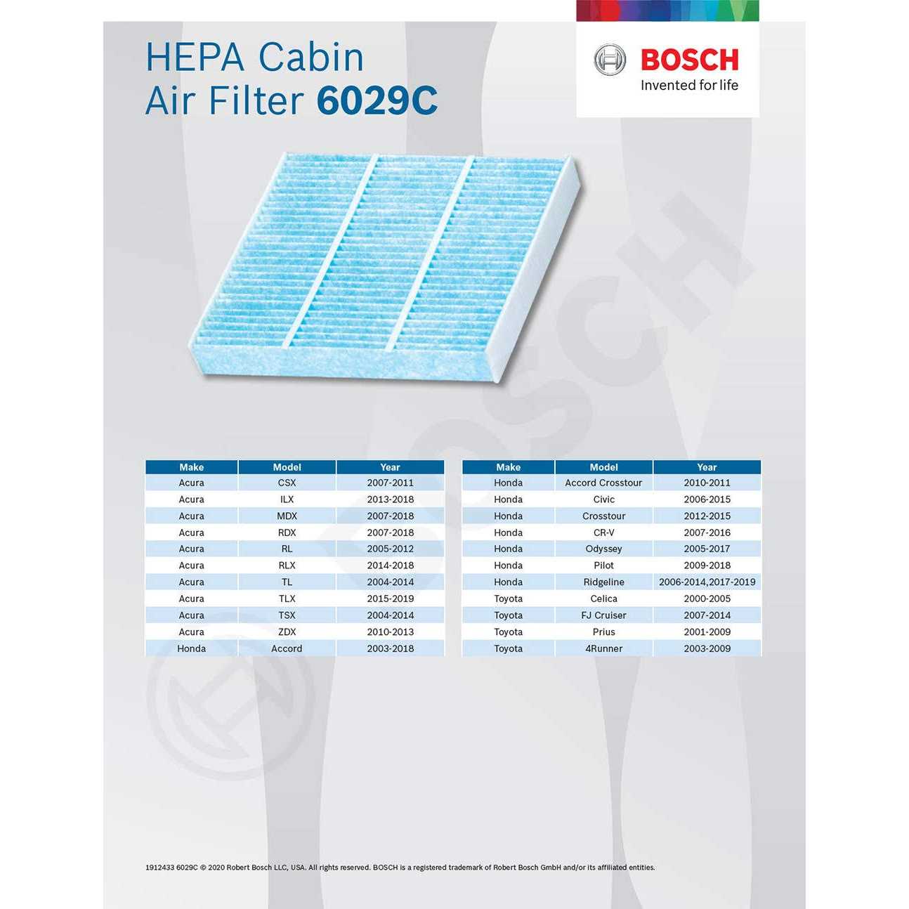 - Without adding formulated chemical odor neutralizer, Bosch HEPA cabin filters provide true clean air to enhance respiratory health