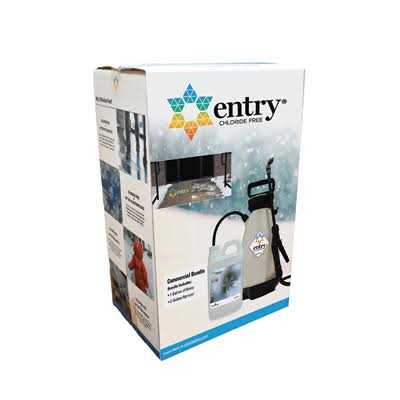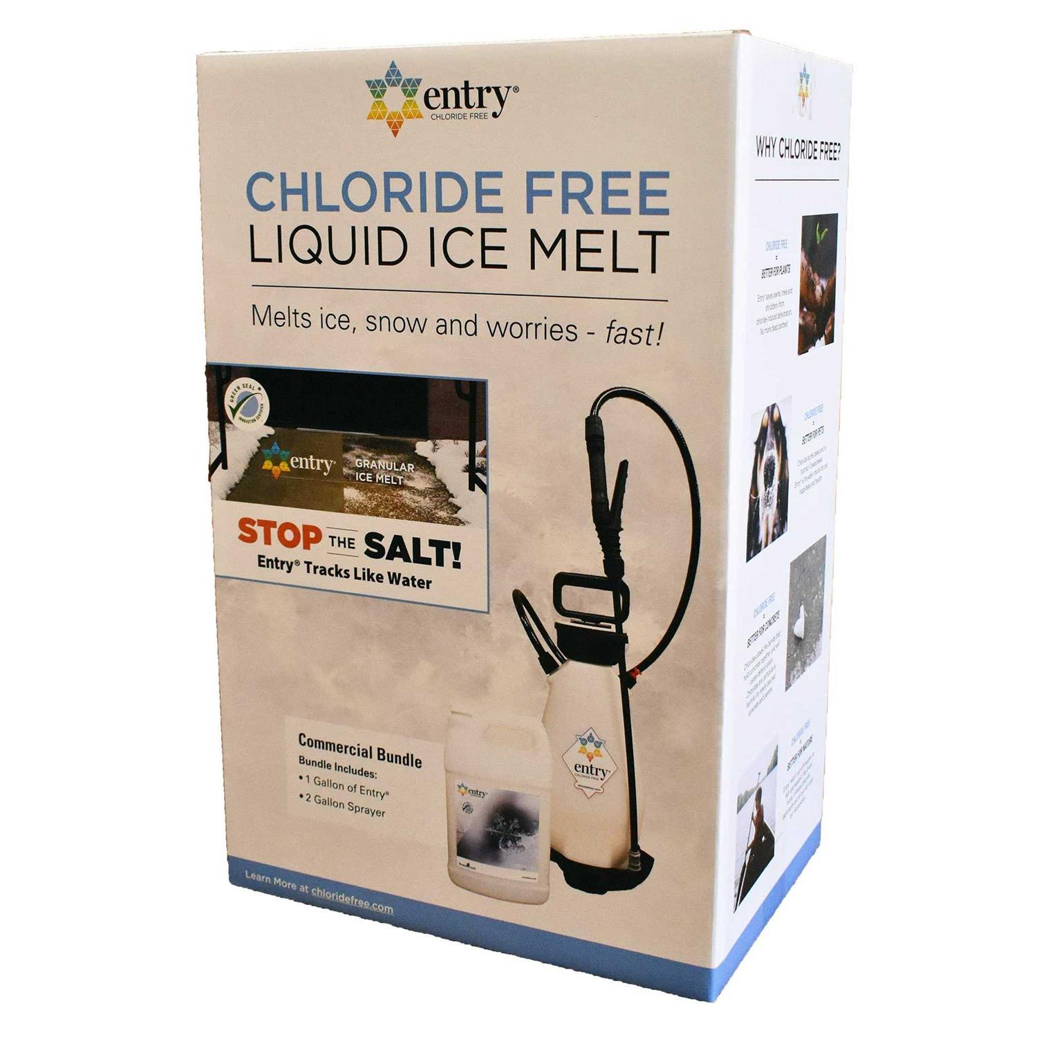 Entry’s proprietary residue-free formulation eliminates the mess and expense of cleaning up ice melt materials inside of homes and buildings. Entry’s clear liquid formulation eliminates the abrasive affect that granular ice melts have on flooring surfaces Entry’s chloride-free formulation is safer for pets, plants, shoes, metals, concrete and the environment. When used as directed Entry will melt snow and ice in less than 30 seconds and prevent refreeze to temperatures below O? F/-19? C. One gallon (3.79 liters) of Entry will provide comparable coverage to 100 pounds (45.36 kg) of traditional ice melt.
