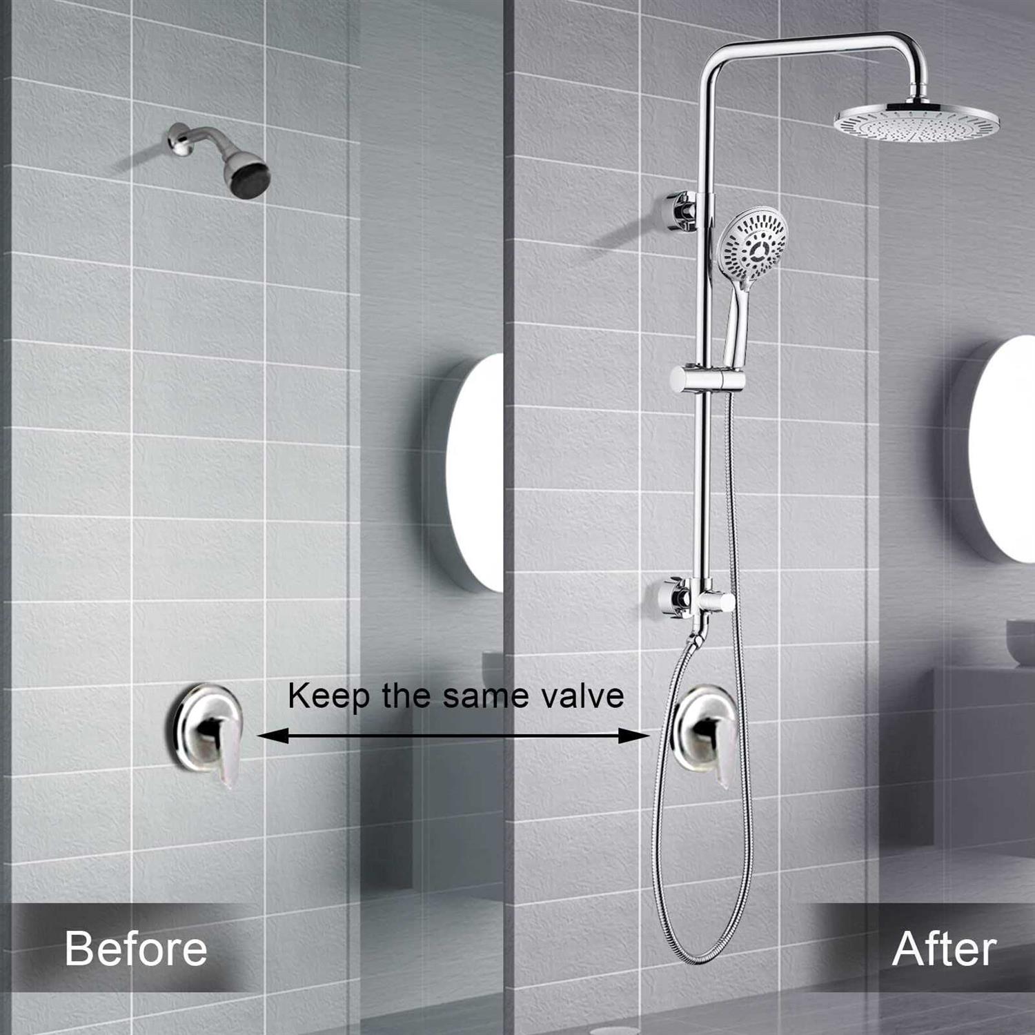 Sturdy Construction: Solid rail engineering with ABS plastic shower heads. Sturdy construction built to last. High standard finish that is easy to clean and maintain and has anti rust properties. Rainfall Shower Head: 9 Inch large overhead rain shower head with 200 jet nozzles to ensure full body coverage. The silicone rubber jet nozzles prevent the build-up of minerals. The adjustable swivel ball joint is made of solid material which makes this rain shower head more durable. 5 Functional Spray Settings – Providing five spray modes for a variety of relaxing options; MASSAGE SPRAY, RAIN SPRAY, MIND BLOWING MISTY SPRAY, HIGH SPEED SPRAY, & PAUSE. The pause feature reduces the water to a trickle which is intended for lathering and Shaving without affecting the temperature settings. Height Adjustable Shower Head: The slider can easily be moved up and down to change the height of your handheld shower head which is convenient for kids or washing a pet. Diverter is located on the bottom of the shaft making it easier to reach for children and older. 30 minute installation with your current in-wall plumbing, drilling free option is available, no need to break out tiles.