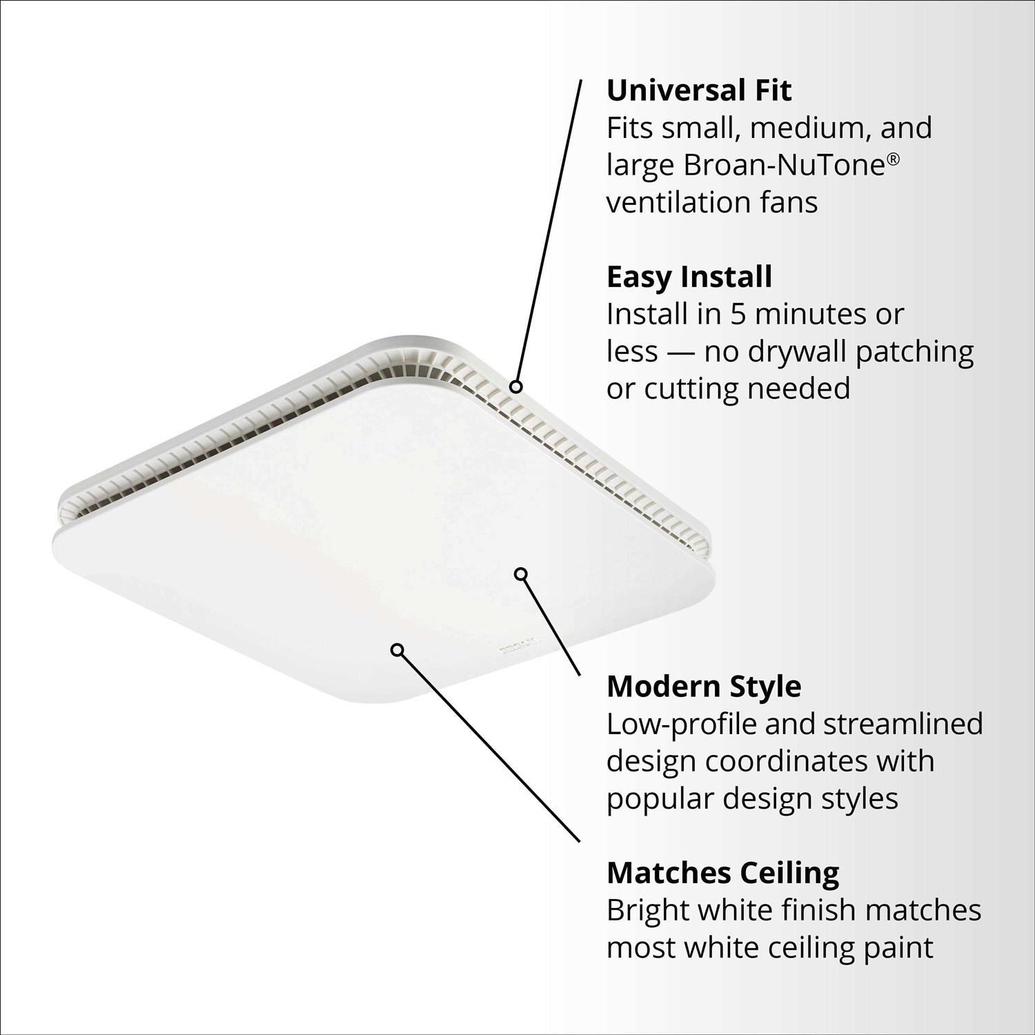Easily revitalize your bath fan with the Broan Universal Clean Cover Upgrade. This fresh, stylish grille is designed to fit small, medium, and large-size Broan and NuTone ventilation fans. It has a crisp, bright white finish to match the most popular white ceiling paint colors. The low-profile Universal CleanCover is sized just right to conveniently cover existing ceiling cuts for an easy install. No ceiling patching or cutting is required.