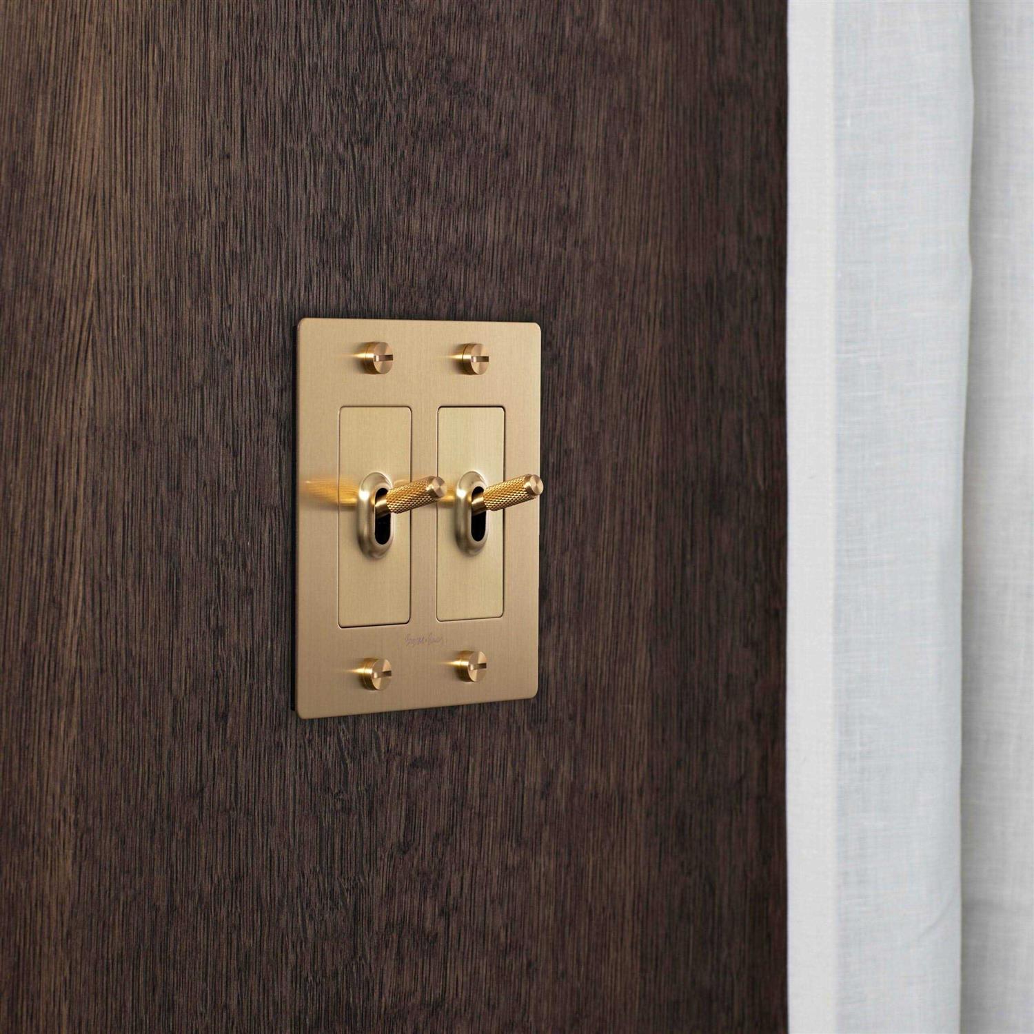 A double toggle switch with a diamond-cut knurled knob to feel amazing with every touch. The switch is finished with a solid metal plate and our signature solid metal penny buttons. Available in 5 different finishes. You can also team them up with our dimmers, duplex and USB outlets in matching finishes.