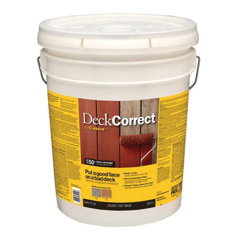 This product is a hardware sealers This product is highly durable Manufactured in United States DeckCorrect by Cabot covers and corrects worn weathered exterior wood and concrete. This thick coating is enhanced with Polycarbonate. Everbeads to fill cracks up to 1/4″ and lock down splinters for a durable dirt-resistant surface. 5 gallon Deck stain Covers corrects better with polycarbonate ever beads Rolls out 50% further Covers up to 75 sqft in 2 coats Use any standard 3/8″ roller cover Fills cracks to 1/4″ locks down splinters Strong skid resistant easier on feet Harder finish resists dirt hoses off easily Application: Shake and stir thoroughly before and during use. If project requires more than 1 container blend all containers together to ensure uniformity. Working in small sections at a time 13 boards use a nylon/polyester brush to dab DeckCorrect into cracks and rough areas before rolling. Use a 3/8″ nap roller to apply a thick even coat rolling lengthwise along boards. Allow to dry 46 hours before applying second coat. Requires a 2-coat application. For best results on vertical surfaces such as railings Cabot Solid Color Stain is recommended.