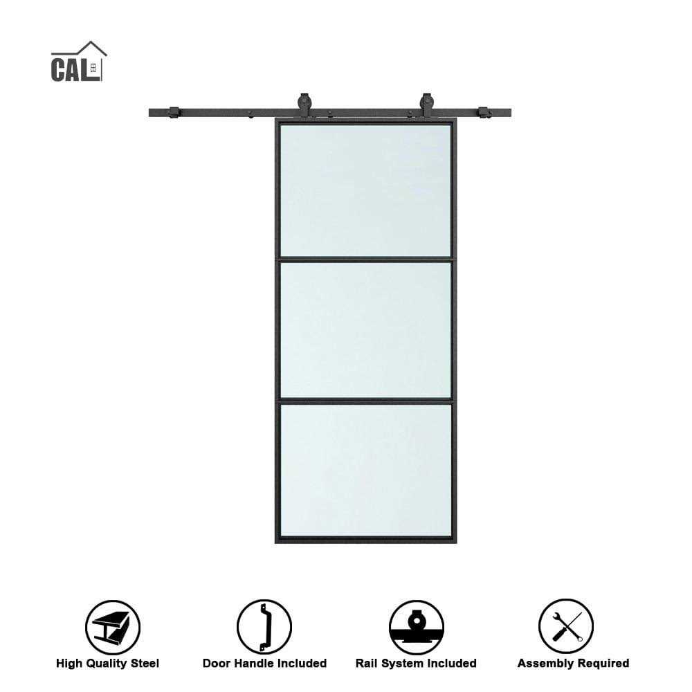 CALHOME 36 in. x 84 in. Full Lite Frosted Glass Black Steel Frame Interior Sliding Barn with Hardware Kit and Door Handle