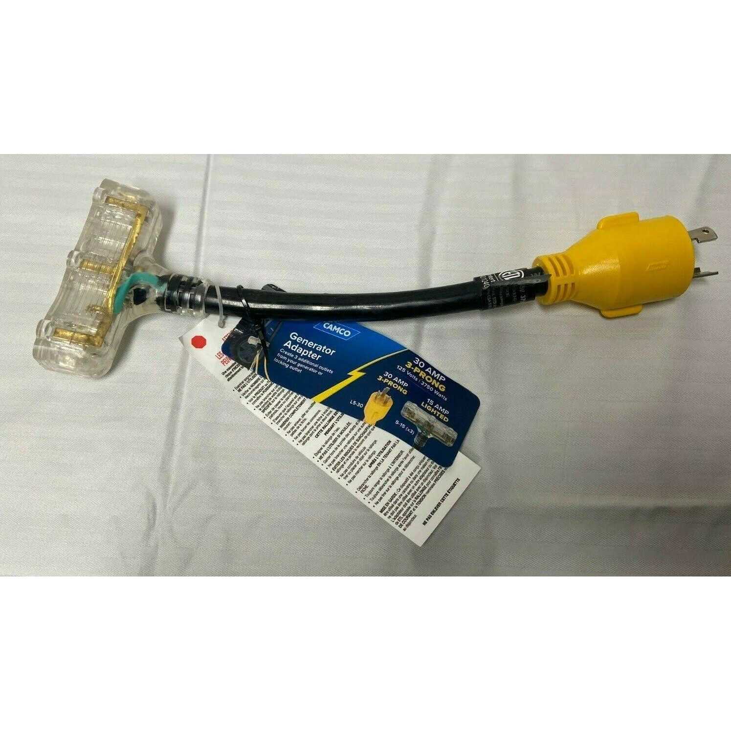 Extremely flexible in design, the cord is coated with a heavy-duty flame retardant, heat-resistant PVC sheath that serves as protection from the outdoor elements, wear and tear. It features a heavy-duty 30-amp locking male (NEMA L5-30P) and three 15-amp female (NEMA 5-15R) connections. The transparent female end will illuminate to indicate when the adapter is plugged in and is able to supply power. Rated for 125 volts, 3750 watts and constructed with 100% copper, 10/3-gauge wires for superior conductivity.