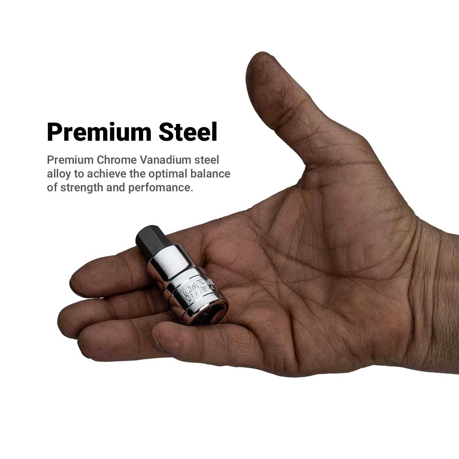 The Capri Tools bit sockets are made for the most demanding professionals. Each of our bit sockets is made from custom forged steel that underwent a proprietary heat treatment process and precisely machined to perform in toughest situations. Premium S2 steel forged bits are exceptionally strong and durable. They withstand high torque and do not twist, protecting both the bit and the fastener. All bits feature chamfered end to ensure a smooth fit onto fasteners. The sockets are constructed with premium Chrome Vanadium steel and plated with our own chrome protective plating. They are durable and resist corrosion. Meets and exceeds ASME B107.110 standards.