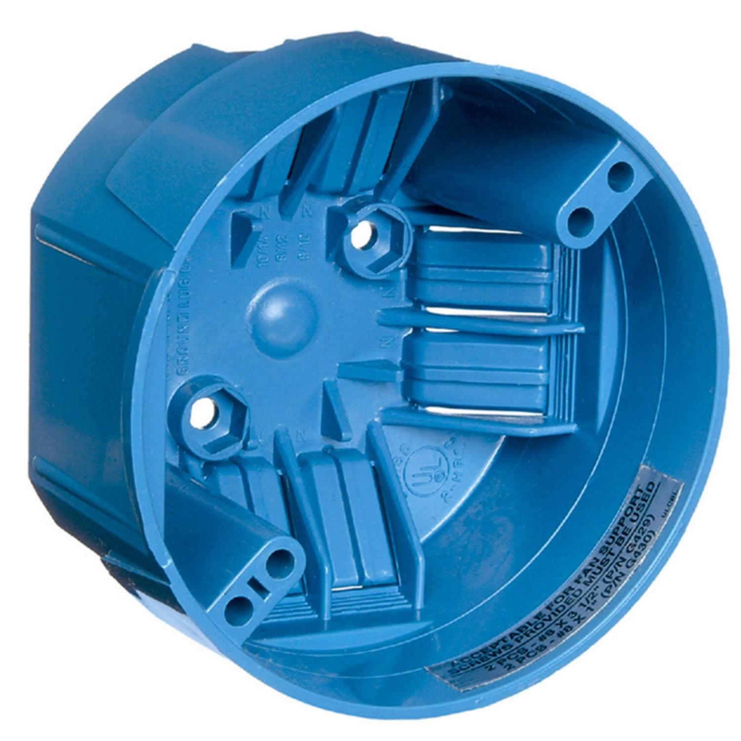 Non-conductive high impact lightweight PVC. Full 20 cubic inch capacity. 6 integral clamps. 4″ diameter x 2-1/4″ depth. Used for new work or renovations. Rated for fans up to 35 pounds and fixture up to 50 pounds. Mounts fan to a cross member secured between ceiling joist. Mounting screws included. UL Listed.