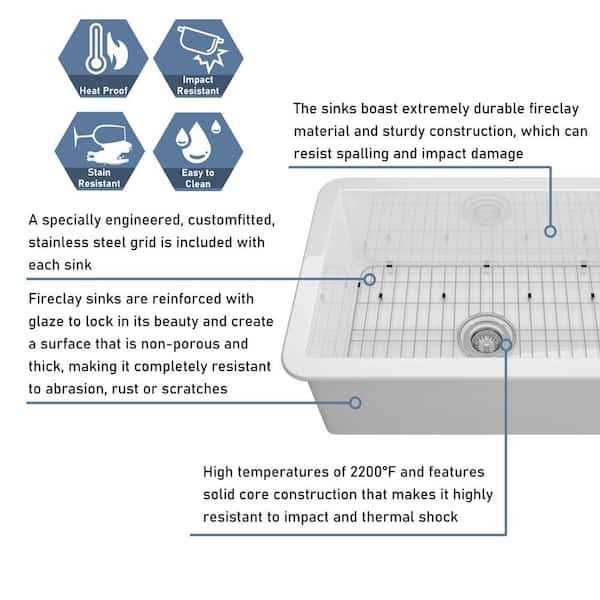 - Fireclay sinks boast extremely durable refractory clay material and sturdy construction, which can resist spalling and impact damage.