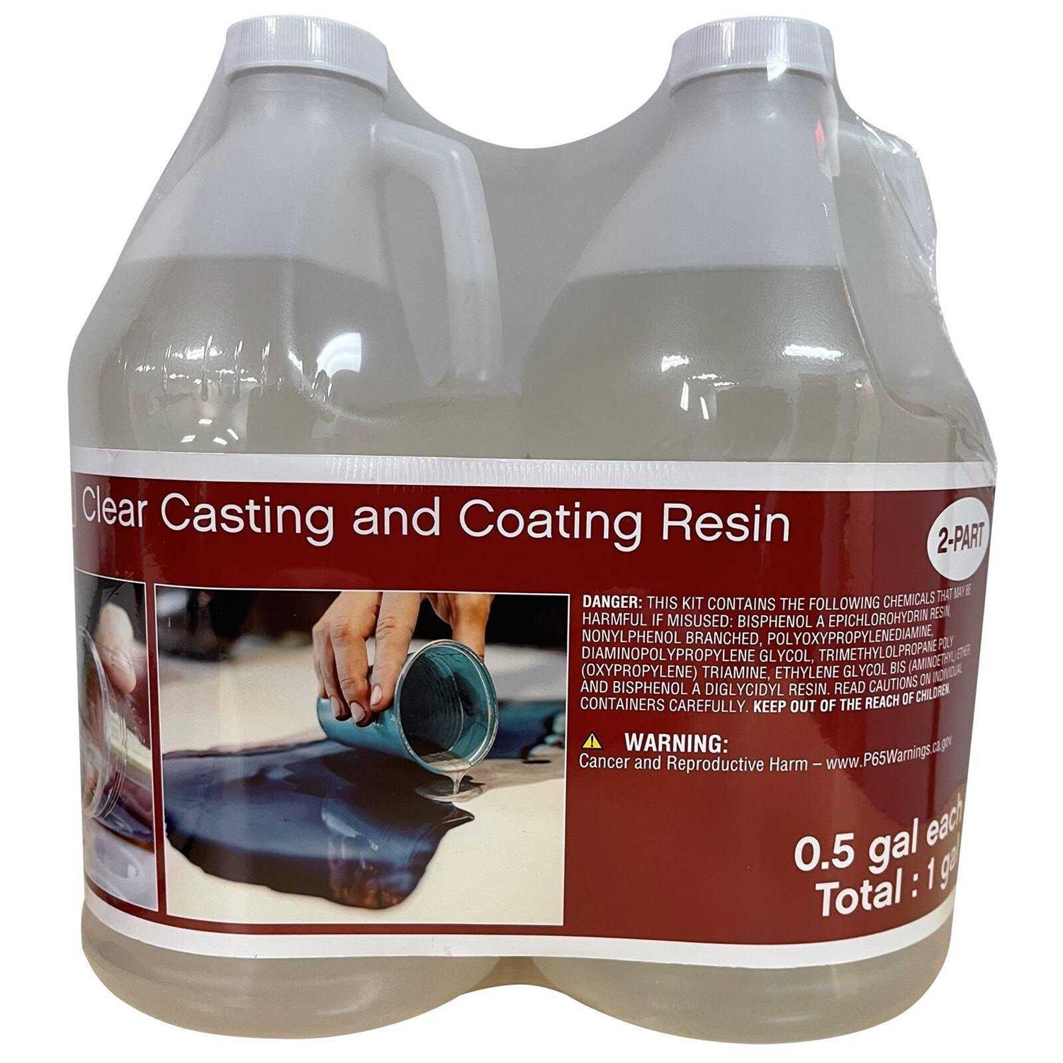 Quality casting and coating epoxy resin that cures to a clear, solid and strong finished with minimal odor. Quality coating epoxy resin that is self-leveling and heat and alcohol resistant. Quality casting and coating epoxy resin that cures to a clear, solid and strong finished with minimal odor. Quality coating epoxy resin that is self-leveling and heat and alcohol resistant. The epoxy coating resin can be use on a variety of medium such as wood, fabric, decals, painted surfaces, dried flowers, plaster, rocks, seashells and more. Durable and resilient it requires zero polishing to produce a high-gloss look. Work time 30 minutes, cures in 12 hours, full strength in 72 hours. Slowly mix for a minimum of 5 minutes. Resin should be completely clear, no swirls or striations. Ensure to scrape the side walls and bottom of the mixture container. Pour immediately after mixing. Ideal mixing and application temperature 75-80°F. DANGER: Contains products that may be harmful. Read warnings on each container.
