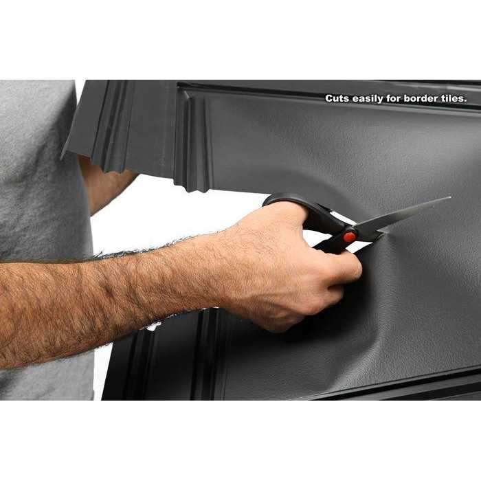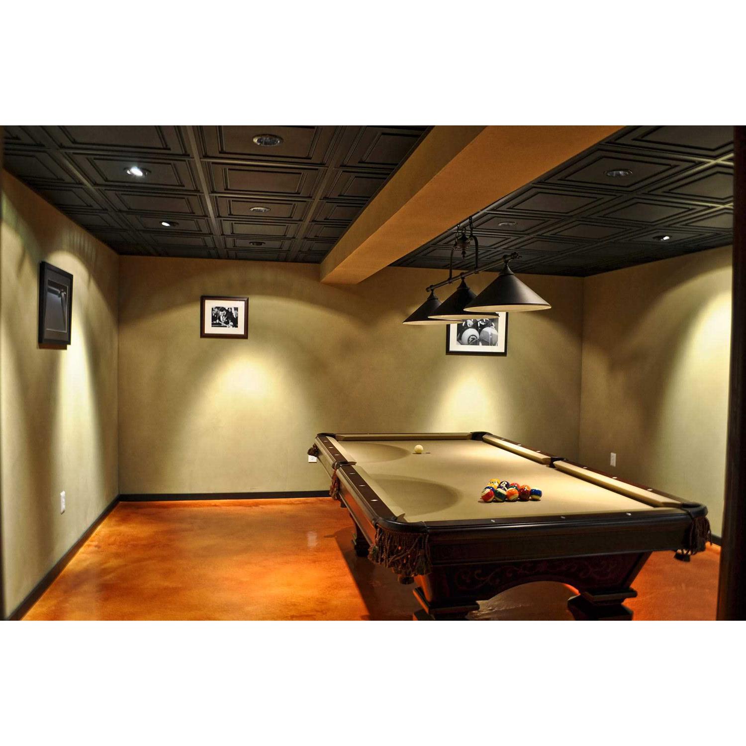 Stratford Black Feather-Light Ceiling Tiles are unlike any ceiling tile you will ever see or feel. When you take them out of the box you will be surprised by the minimal weight of their Feather-Light construction. Ceilume Stratford tiles are formed from a thin sheet of vinyl that is only 0.013 in. thick about the thickness of a business card. But the Stratford’s geometric design combined with the inherent strength of vinyl makes these tiles rigid, durable and easy to install. The Stratford Black Feather-Light Ceiling Tiles are not at all like the old mineral fiber tiles you’re used to seeing and that’s a good thing. They don’t generate dust, they’re unaffected by moisture, they don’t harbor mold and they’re easy to cut. Their black finish is refined, pure, and easy to clean. Place them in your ceiling grid and you’ll be thrilled by the way the Stratford improves the look of your room.
