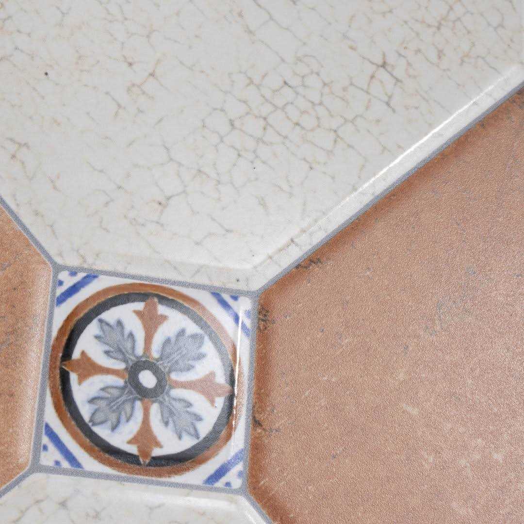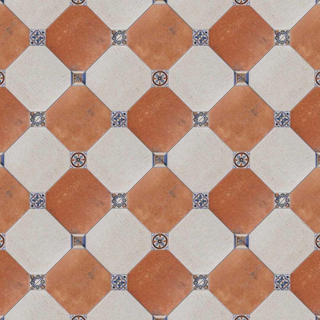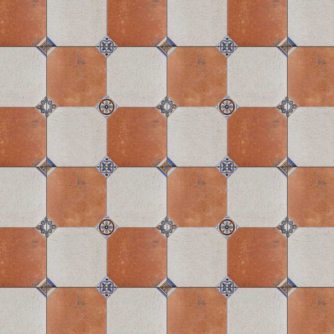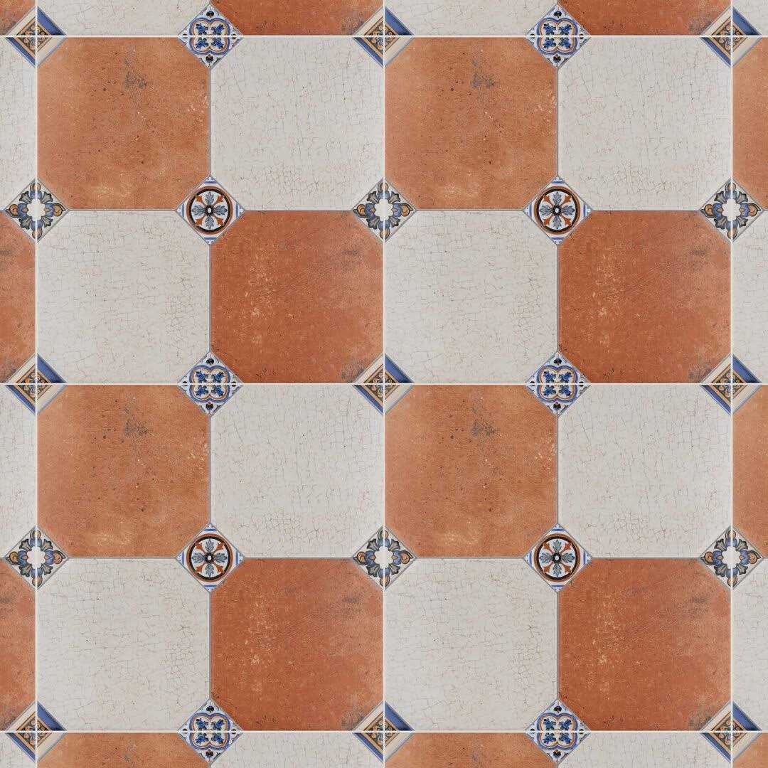 EliteTile The ceramic floor and wall tile in white and orange are semi-vitreous and feature a crackle glaze for a unique finish. The simple alternating brick and beige coloured squares with blue-green and orange accents.