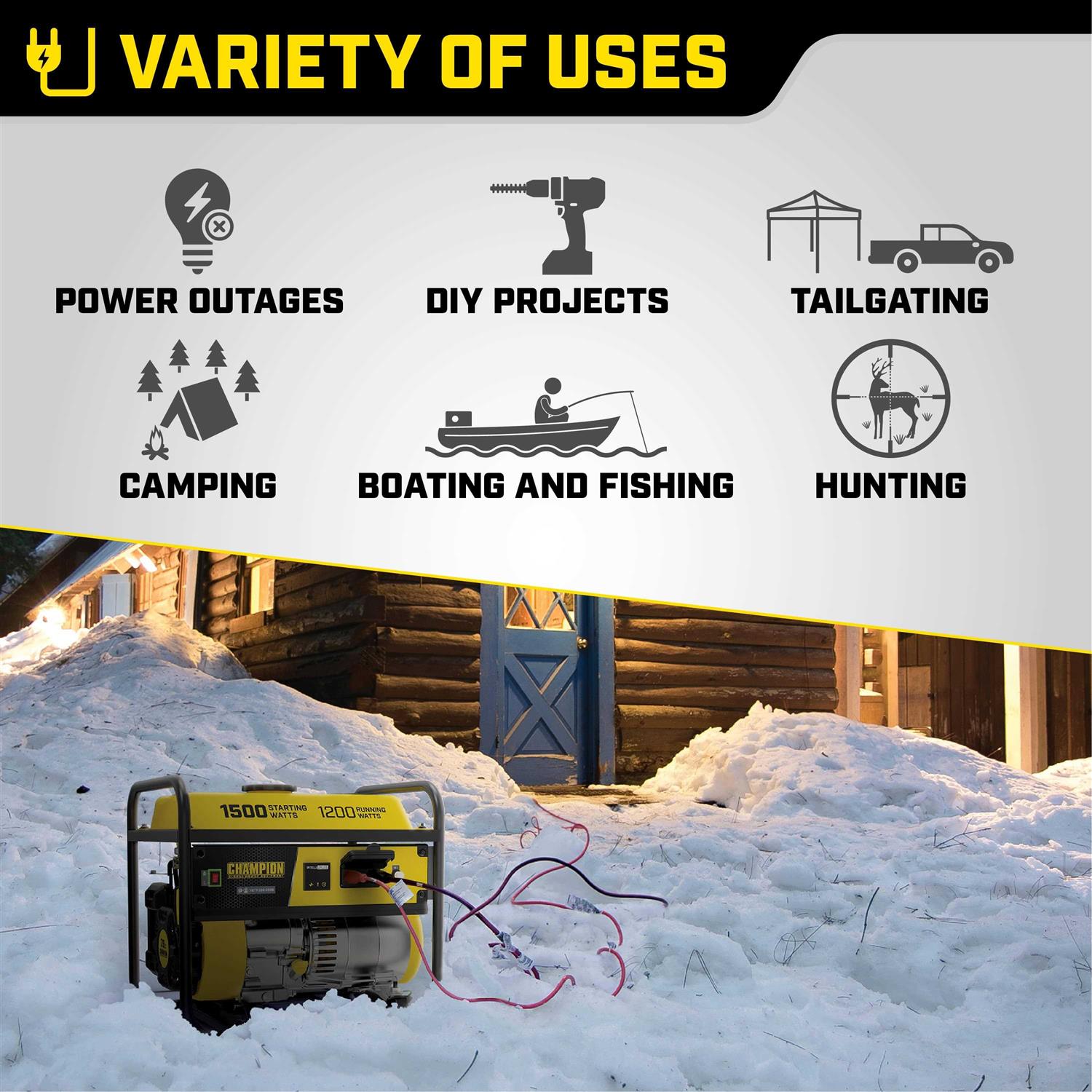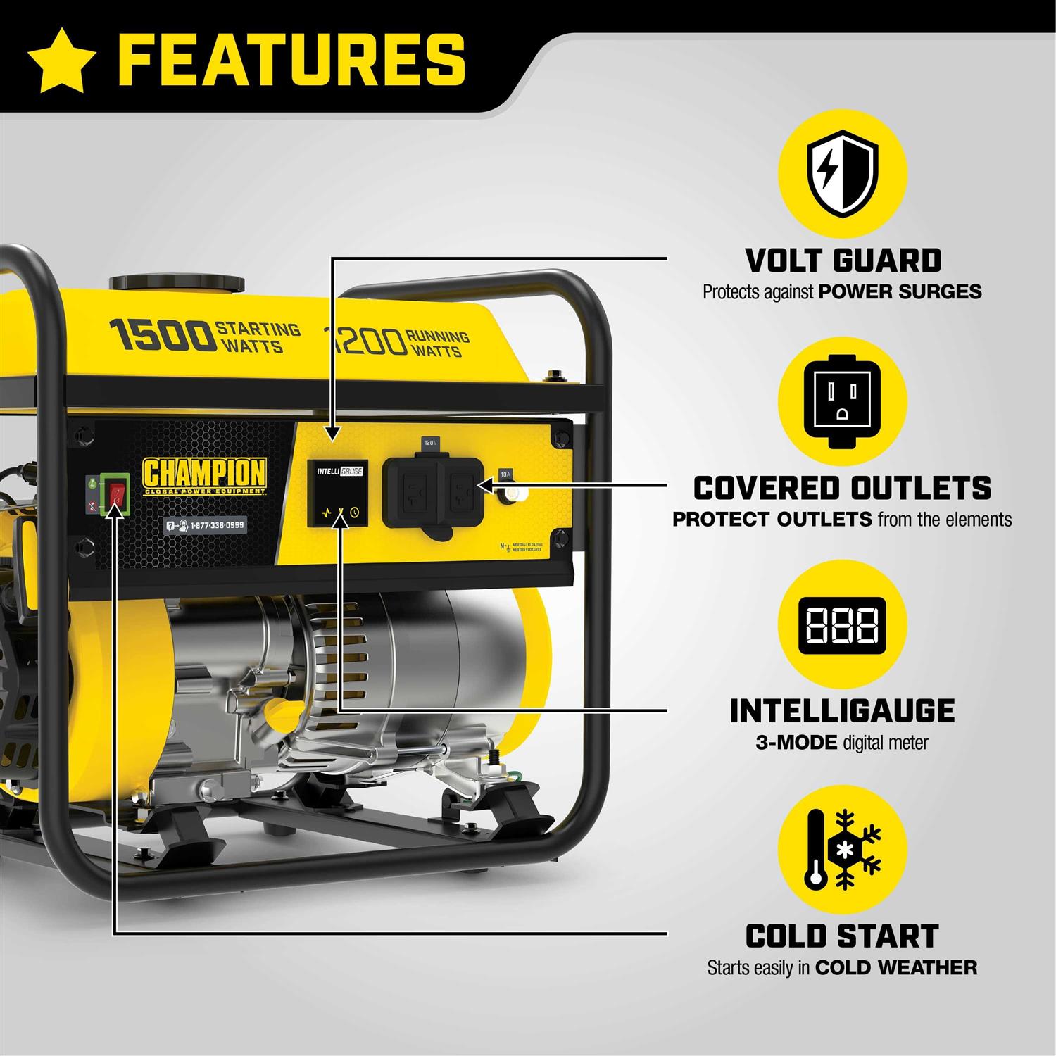The Champion Power Equipment 200915 1200-Watt Multi-Purpose Portable Generator is designed with your safety and convenience in mind, and is the perfect “what if” generator. At 1500 starting watts and 1200 running watts, this rugged generator with its durable steel frame is easy to transport and provides just what you need for RV use, camping, tailgating, boating, hunting, weekend trips, family vacations and small jobs around the house. The next time there’s an outage, the 79cc Champion single-cylinder OHV engine will provide the power you need for a few essential items in an emergency – lights, microwave, fan, TV, modem/router, cell phone charger, etc. (Note: this unit is not recommended for emergency home backup for powering air conditioners, stoves, furnaces or sump pumps). Power up with Champion’s reliable recoil start, plus Cold Start Technology ensures a quick start in cold weather. Champion also makes it easy to monitor voltage, frequency and operating hours with Intelligauge. This unit includes two 120V 20A covered household outlets (5-20R). Designed for safety with convenient push-to-reset circuit breakers, a low oil shut-off sensor plus an included oil funnel for easy changes. The reliable 80cc single-cylinder OHV Champion engine produces 1500 starting watts and 1200 running watts, and will run for up to 10 hours at 50% load when the 1.5-gallon tank of gasoline is full. Champion’s thoughtful packaging and clear directions make setup hassle free.