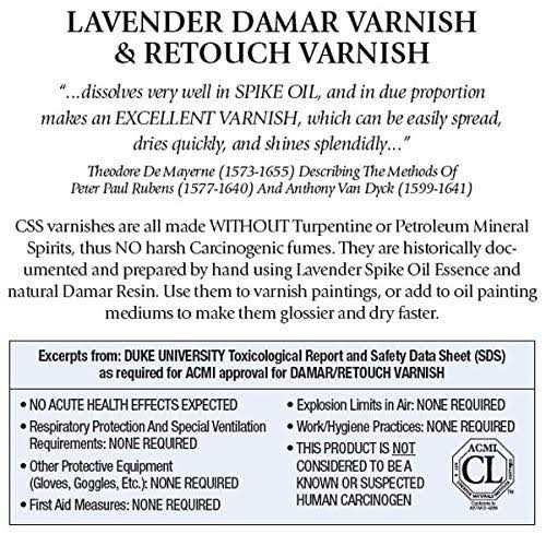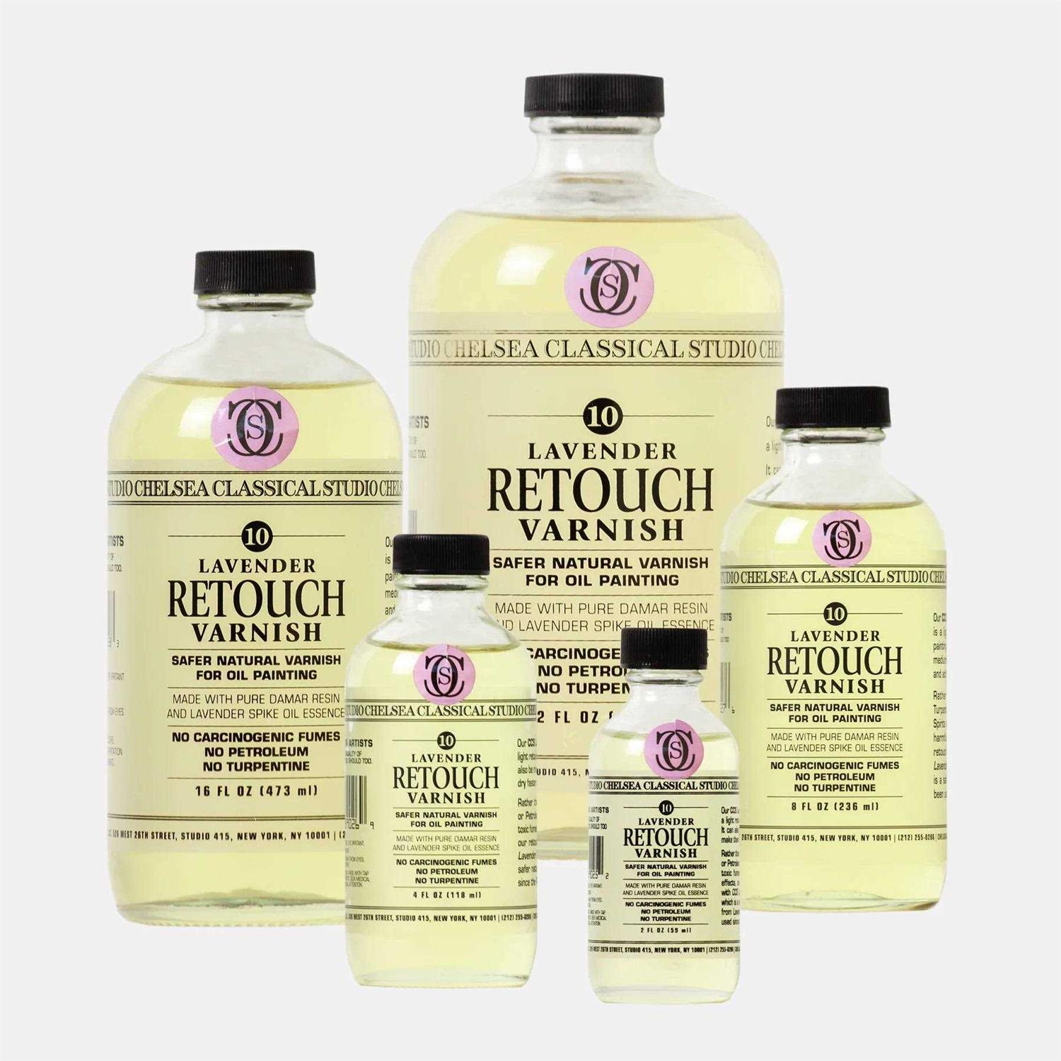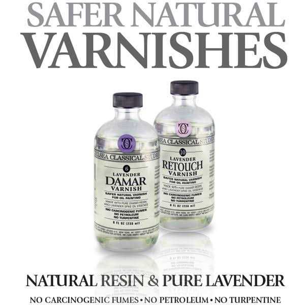 Chelsea Classical Studio brings you a line of safer, natural varnishes for your oil paintings. No harsh chemicals are used in their production — no petroleum, no turpentine, and no dangerous fumes. Made with CCS Lavender Spike Oil Essence, these varnishes feature a distinctive lavender scent. They’re prepared by hand using premium natural materials and formulas based on historic recipes and techniques. Lavender Retouch Varnish offers superior, classic protection for your oil paintings. Made with pure damar resin and CCS Lavender Spike Oil Essence, this varnish allows for both protection and breathability. This product contains Lavender Spike Oil Essence, which is a historically documented solvent used since the Renaissance. It is non-carcinogenic and has a strong herbaceous scent. Use in a well-ventilated area, and it may not be suitable for people who are sensitive to strong scents. Our Painting Varnishes come in glass bottles.