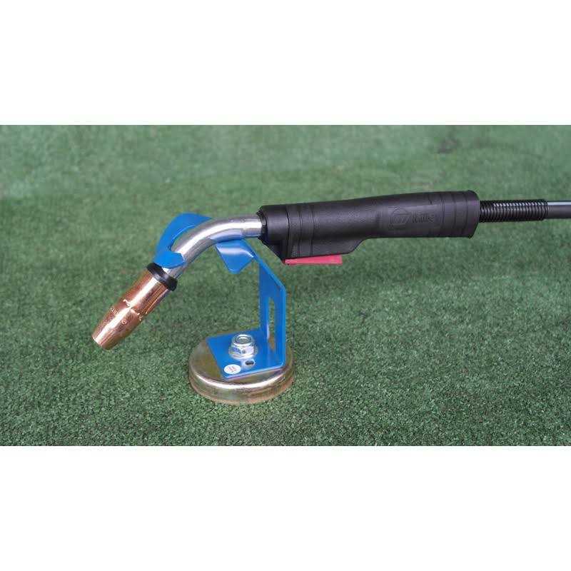 This magnetic MIG torch stand keeps your MIG torch safe from being damaged when you’re not using it. The torch stand’s powerful 2-3/4 in. magnet clamps to your workbench or the side of your welder and can work either vertically or horizontally. The torch stand has a durable enamel finish with a zinc coated base for added durability.