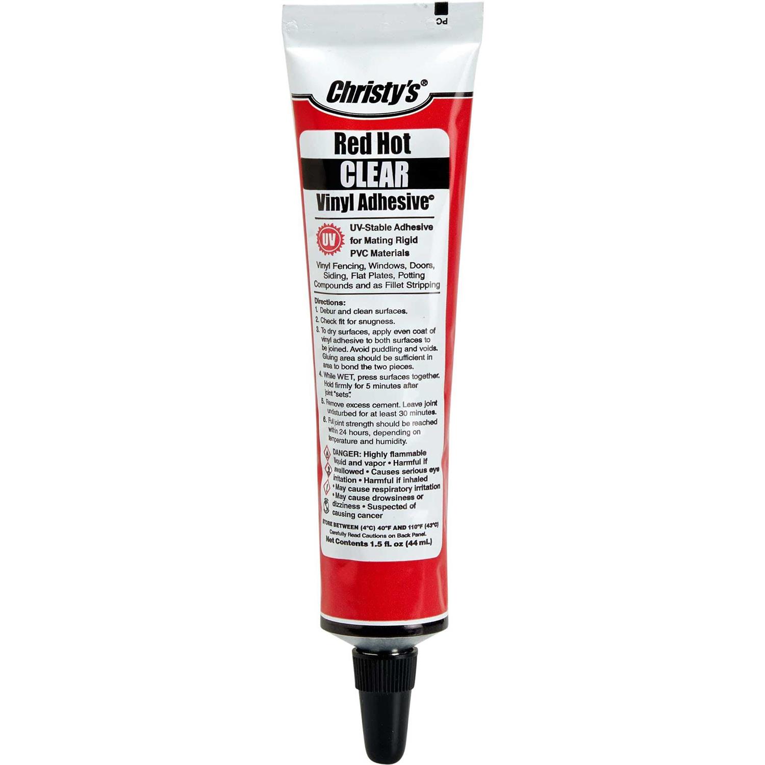 Christy’s Red Hot Vinyl Adhesive, Clear, 1.5 oz Tube Christy’s Red Hot Vinyl Adhesive can be used on all types of surfaces and colors such as Vinyl or PVC fencing, decks, windows, siding, furniture, and railings. This adhesive’s unique formula ensures optimal, high-strength adhesion. This product is formulated to last long, dry clear, and keep a clean look. Best of all, this adhesive has a water-proof bond. The product offers UV-stable outstanding performance and will not discolor or crack. Red Hot Vinyl Adhesive is made to resist aging, yellowing, and becoming brittle due to sunlight. This flexible adhesive is resistant to grease, oil, chemicals, and fuel, all while remaining stable during extreme temperatures or weather events. For filling gaps and mending, the best choice is Red Hot Vinyl Adhesive for a clear, clean installation. This product will keep the clear color’s integrity without fading after applying it to a surface.