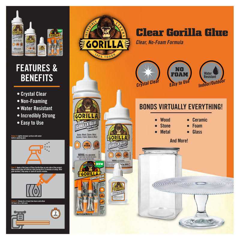 The strength and versatility you have come to expect from Gorilla Glue is now available in an easy to use, crystal clear, non-foaming formula. Incredibly strong and is ideal for indoor and outdoor applications and bonds virtually everything from wood to stone to glass and more. Paintable, sandable, and stainable, perfect for your many household projects. Extended working time, which allows you to reposition your project. It is also minimally gap filling, which allows you to glue uneven surfaces. Storage Tips – After each use, wipe nozzle clean with a dry cloth and tightly replace lid. Store in a cool, dry place with exposure to light. Lack of light and heat can cause product to yellow. Cured glue can be removed from work surface with chisel, scraper or sandpaper.