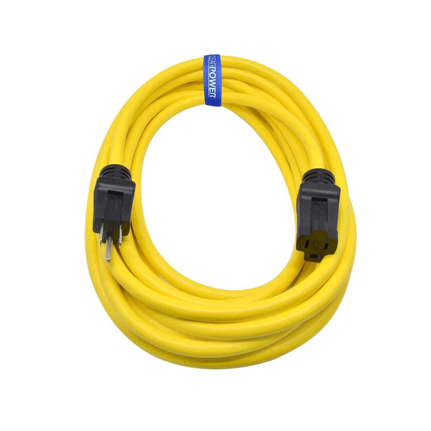 This 25 ft extension cord is ideal for use with heavy duty power tools and appliances, Grounded plug and connector Water, weather, kink & abrasion resistant, flame retardant Works in temperatures from -40°F up to 140°F Nickel coated brass blades won’t corrode which helps prevent arcing Agency tested and certified for use in the USA & Canada This Clear Power CP10144 Heavy Duty (12/3 Gauge) 25 ft outdoor extension cord is water resistant, weather resistant, abrasion resistant and flame retardant. Clear Power bright yellow 25 ft extension cord is made for work on job sites and handles up to a 15 amp load. 15Amps/125Volts/1875Watts.
