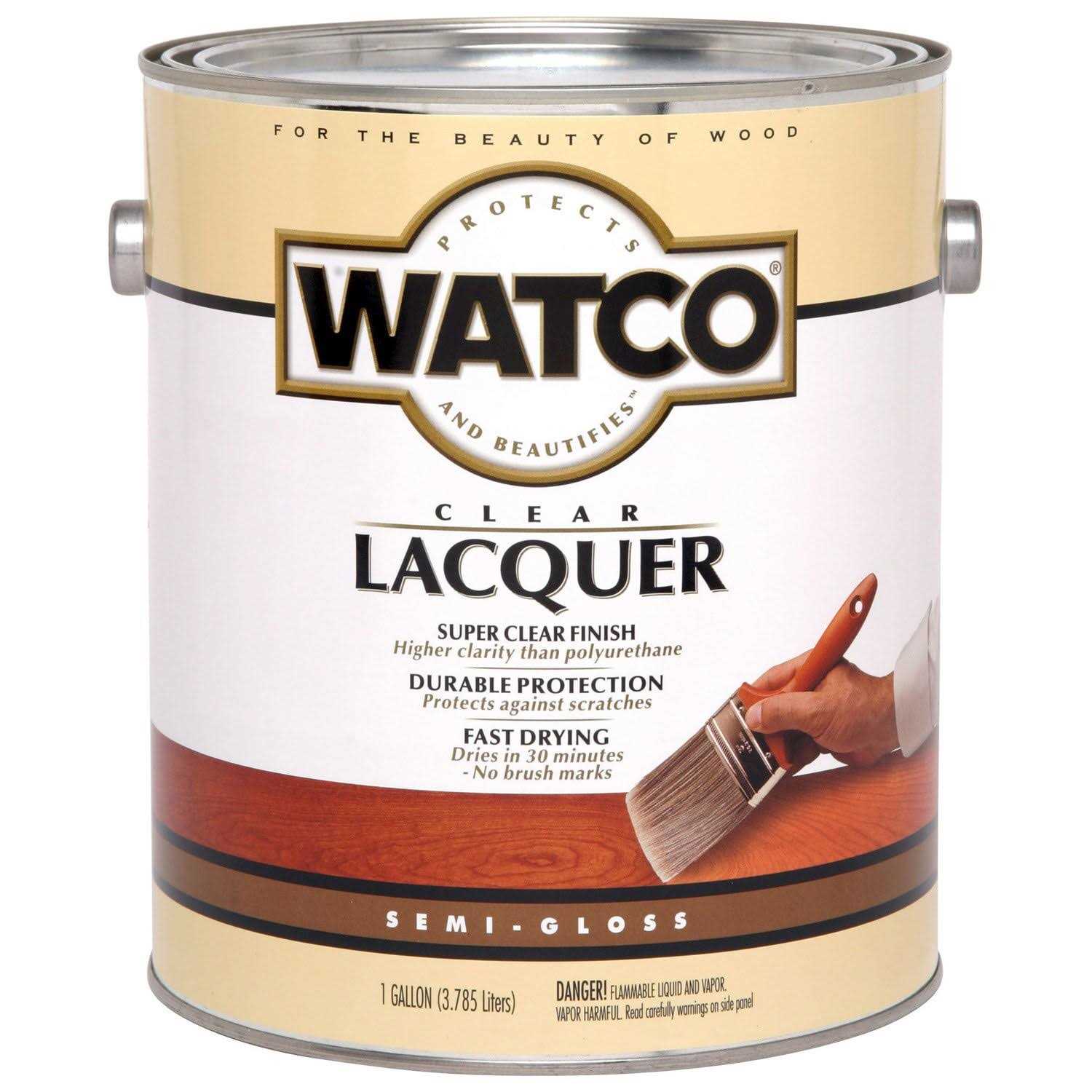 WATCO Lacquer clear wood finish is the finest brushing lacquer available. WATCO Lacquer fills in the pores of most wood types eliminating the need for wood filler. Apply to furniture, doors, cabinets and paneling for a crystal-clear, durable wood finish. Dries in 30 mins and does not require sanding between coats. Please read product labels for additional directions and precautions before using.