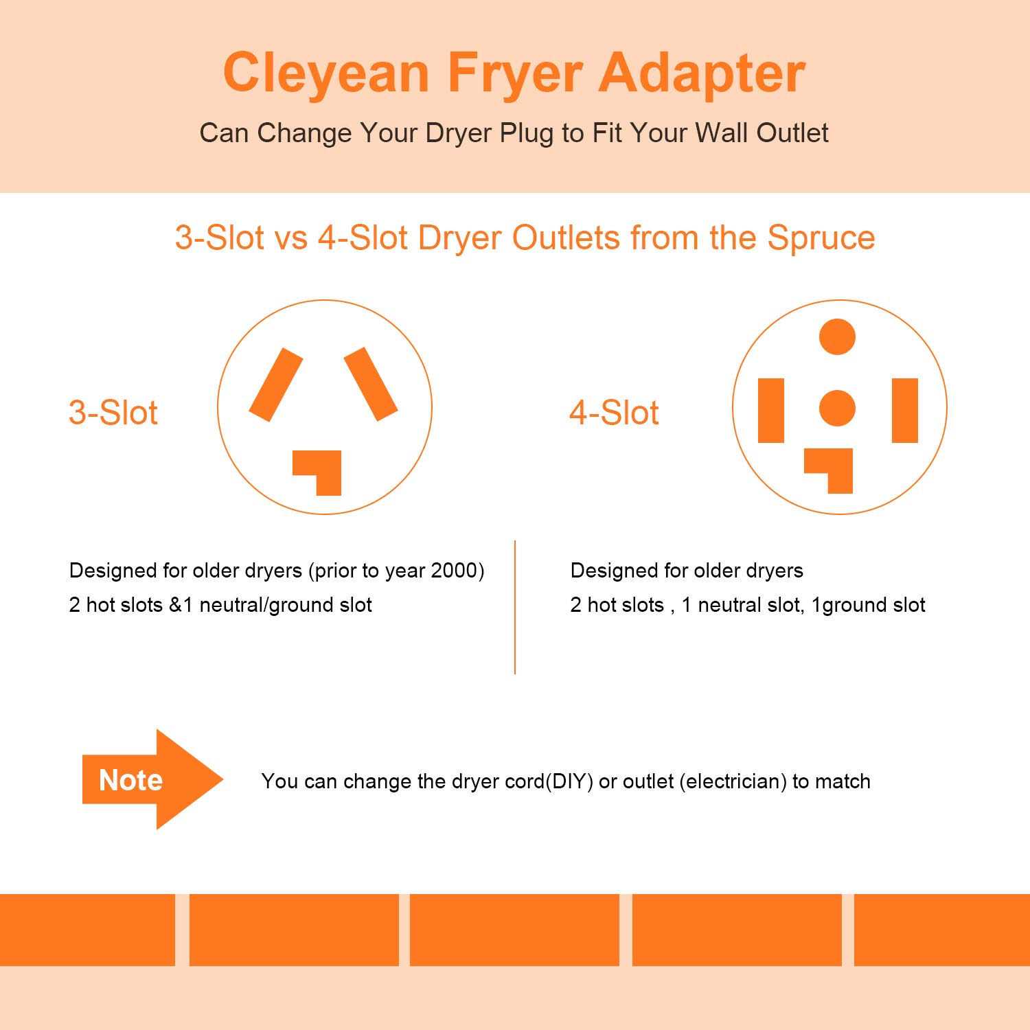 Adapters by Cleyean. Details:when you move into a new apartment or house that has the 4 prong outlet while your dryer is with 3 prong plug, please consider this plug. Important Note: The 4 prong plug of this converter plug into household outlet, the end 3 prong socket of this converter connects to your dryer plug. Please refer to the picture carefully. Easily connects your 3 prong dryer to 4 prong home outlet.
